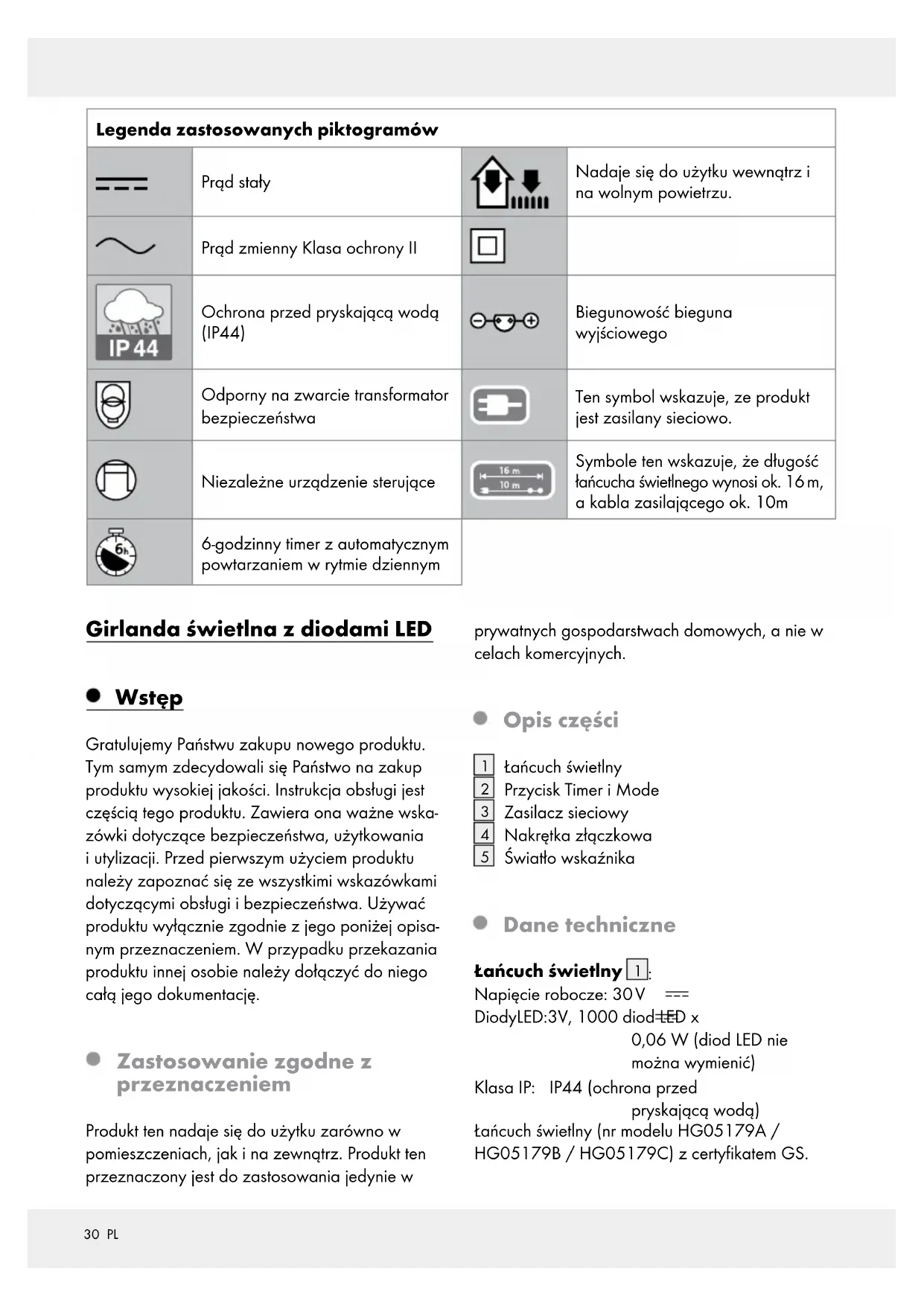 50/60 Hz Napięcie znamionowe wtórne: 30 V 300 mA, 9 W Klasa ochrony: Klasa IP: IP44 (ochrona przed pryskającą wodą) Zasilacz sieciowy (nr modelu S090G300W8D) sprawdzony przez GS. HG05179A: ciepła biel HG05179B: zimna biel HG05179C: wiele kolorów Zawartość 1 łańcuch świetlny 1 zasilacz sieciowy 1 instrukcja obsługi Wskazówki bezpieczeństwa