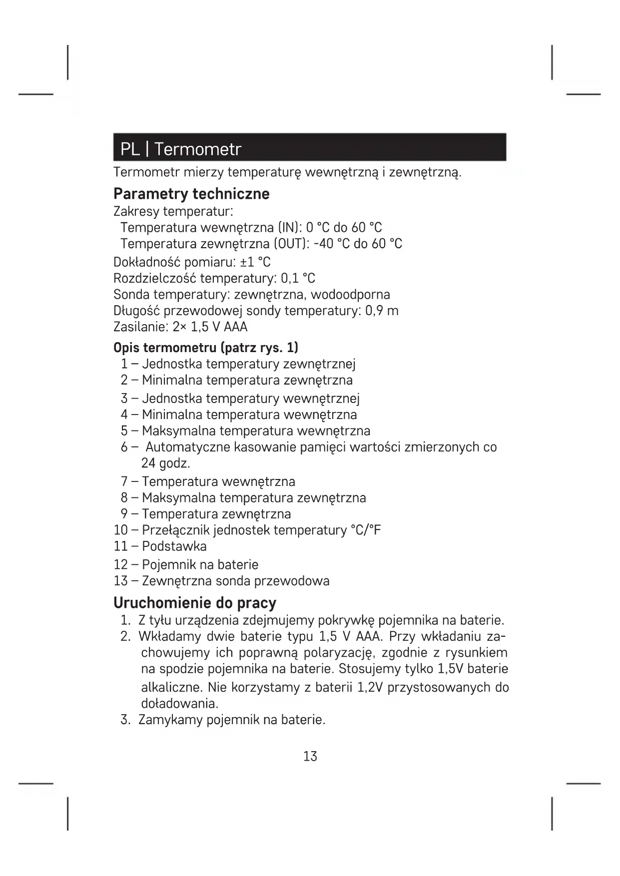 - Akumulatora nie wrzucamy do ognia, nie rozbieramy i nie zwieramy. To urządzenie nie jest przeznaczone do użytkowania przez osoby (w tym dzieci), którym brak predyspozycji zycznych, umysłowych albo mentalnych oraz brak wiedzy albo doświadczenia uniemożliwia bezpieczne korzystanie z tego wyrobu, jeżeli nie jest nad nimi spra- wowany nadzór albo, jeżeli nie zostały poinstruowane, co do zasad korzystania z tego produktu przez osobę, która jest odpowiedzialna16 za ich bezpieczeństwo. Konieczne jest zapewnienie takiej opieki nad dziećmi, żeby nie mogły się bawić tym wyrobem. Zgodnie z przepisami Ustawy o ZSEiE zabronione jest umiesz- czanie łącznie z innymi odpadami zużytego sprzętu oznako- wanego symbolem przekreślonego kosza. Użytkownik, chcąc pozbyć się sprzętu elektronicznego i elektrycznego, jest zo- bowiązany do oddania go do punktu zbierania zużytego sprzętu. W sprzęcie nie znajdują się składniki niebezpieczne, które mają szcze- gólnie negatywny wpływ na środowisko i zdrowie ludzi. HU | Hőmérő A hőmérő beltéri és kültéri hőmérsékletet mér. Műszaki paraméterek Hőmérséklet-tartomány: Beltéri hőmérséklet (IN): 0 °C és 60 °C között Kültéri hőmérséklet (OUT): -40 °C és 60 °C között Mérési pontosság: ±1 °C Hőmérséklet osztásköze: 0,1 °C Hőmérő szonda: kültéri, vízálló Vezetékes hőmérő szonda hossza: 0,9 m Tápellátás: 2 db 1,5 V AAA A hőmérő leírása (l. 1. ábra) 1 – Kültéri hőmérséklet mértékegysége 2 – Minimális kültéri hőmérséklet 3 – Beltéri hőmérséklet mértékegysége 4 – Minimális beltéri hőmérséklet 5 – Maximális beltéri hőmérséklet 6 – Mért értékek automatikus törlése a memóriából 24 óránként 7 – Beltéri hőmérséklet 8 – Maximális kültéri hőmérséklet 9 – Kültéri hőmérséklet 10 – A hőmérséklet mértékegységének kiválasztása °C/°F 11 – Állvány 12 – Elemtartó rekesz 13 – Kültéri vezetékes szonda17 Üzembehelyezés