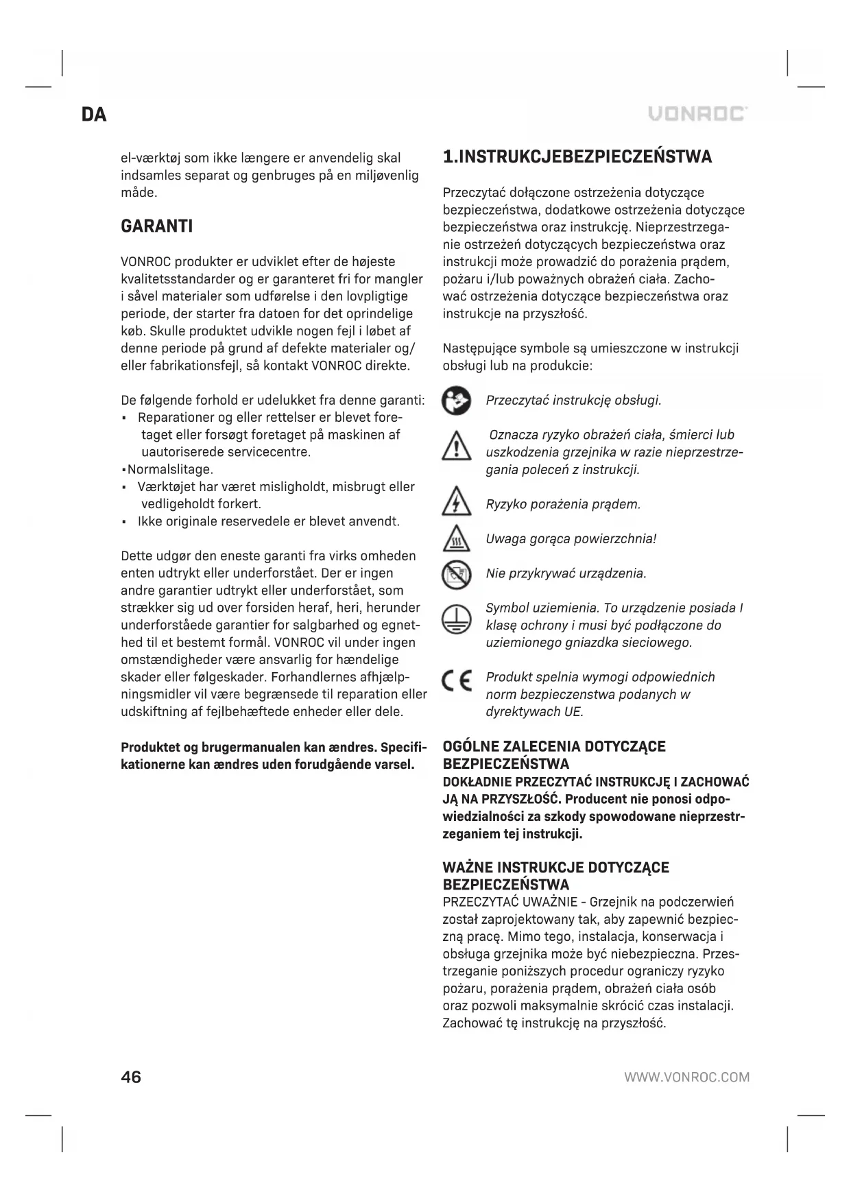 - Sprawdzić, czy włączniki zasilania są ustawione w położenie włączenia. Jeśli nie, ustawić je odpowiednio. SRODOWISKO Uszkodzone i/lub niepotrzebne urzadzenia elektryczne lub elektroniczne podlegaja zbiórce w odpowiednich punktach recyklingu. Tylko kraje WE Nie wyrzucac elektronarzedzi wraz z odpadami z gospodarstw domowych. Zgodnie z dyrektywa 2012/19/WE dotyczaca zuzytych urzadzen elektrycz- nych i elektronicznych oraz jej wdrozeniem do prawo- dawstwa krajowego, elektronarzedzia, które juz nie nadaja sie do uzytku, podlegaja oddzielnej zbiórce oraz utylizacji w sposób przyjazny dla srodowiska. GWARANCJA Produkty VONROC są wytwarzane zgodnie z najwyż- szymi standardami jakości i producent udziela gwarancji na wady materiałowe i wady wykonania na okres wymagany prawem, licząc od dnia zaku- pu. Jeśli wystąpi usterka produktu w tym okresie spowodowana wadą materiałową i/lub wadą wykonania, proszę bezpośrednio skontaktować się ze sprzedawcą VONROC. Następujące okoliczności powodują unieważnienie gwarancji: