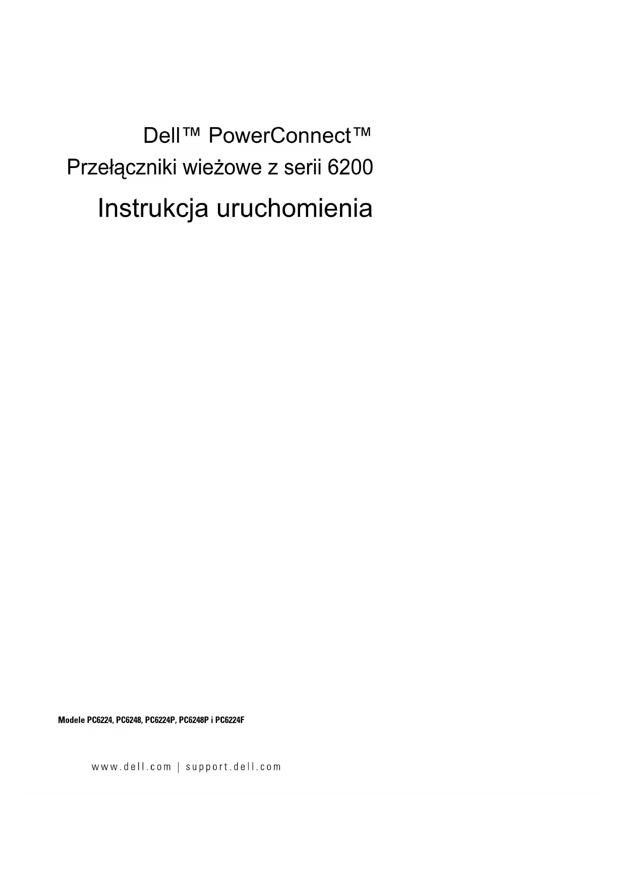 없음190 시작 설명서 www.dell.com | support.dell.comwww.dell.com | support.dell.com Dell™ PowerConnect™ Przełączniki wieżowe z serii 6200 Instrukcja uruchomienia Modele PC6224, PC6248, PC6224P, PC6248P i PC6224FUwagi, pouczenia i ostrzeżenia UWAGA: UWAGA oznacza ważną informację pozwalającą na lepsze wykorzystanie możliwości komputera. POUCZENIE: POUCZENIE wskazuje na możliwość uszkodzenia sprzętu lub utraty danych i informuje o sposobie uniknięcia problemu. OSTRZEŻENIE: OSTRZEŻENIE wskazuje na możliwość wystąpienia szkody materialnej oraz potencjalne niebezpieczeństwo obrażeń ciała lub śmierci.