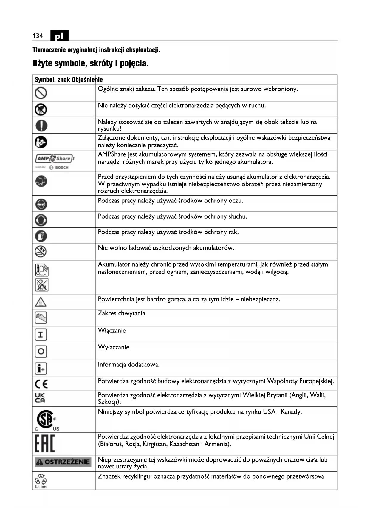 Tłumaczenie oryginalnej instrukcji eksploatacji. Użyte symbole, skróty i pojęcia. Symbol, znak Objaśnienie Ogólne znaki zakazu. Ten sposób postępowania jest surowo wzbroniony. Nie należy dotykać części elektronarzędzia będących w ruchu. Należy stosować się do zaleceń zawartych w znajdującym się obok tekście lub na rysunku! Załączone dokumenty, tzn. instrukcję eksploatacji i ogólne wskazówki bezpieczeństwa należy koniecznie przeczytać. AMPShare jest akumulatorowym systemem, który zezwala na obsługę większej ilości narzędzi różnych marek przy użyciu tylko jednego akumulatora. Przed przystąpieniem do tych czynności należy usunąć akumulator z elektronarzędzia. W przeciwnym wypadku istnieje niebezpieczeństwo obrażeń przez niezamierzony rozruch elektronarzędzia. Podczas pracy należy używać środków ochrony oczu. Podczas pracy należy używać środków ochrony słuchu. Podczas pracy należy używać środków ochrony rąk. Nie wolno ładować uszkodzonych akumulatorów. Akumulator należy chronić przed wysokimi temperaturami, jak również przed stałym nasłonecznieniem, przed ogniem, zanieczyszczeniami, wodą i wilgocią. Powierzchnia jest bardzo gorąca. a co za tym idzie – niebezpieczna. Zakres chwytania Włączanie Wyłączanie Informacja dodatkowa. Potwierdza zgodność budowy elektronarzędzia z wytycznymi Wspólnoty Europejskiej. Potwierdza zgodność elektronarzędzia z wytycznymi Wielkiej Brytanii (Anglii, Walii, Szkocji). Niniejszy symbol potwierdza certyfikację produktu na rynku USA i Kanady. Potwierdza zgodność elektronarzędzia z lokalnymi przepisami technicznymi Unii Celnej (Białoruś, Rosja, Kirgistan, Kazachstan i Armenia). Nieprzestrzeganie tej wskazówki może doprowadzić do poważnych urazów ciała lub nawet utraty życia. Znaczek recyklingu: oznacza przydatność materiałów do ponownego przetwórstwa max.50°C135