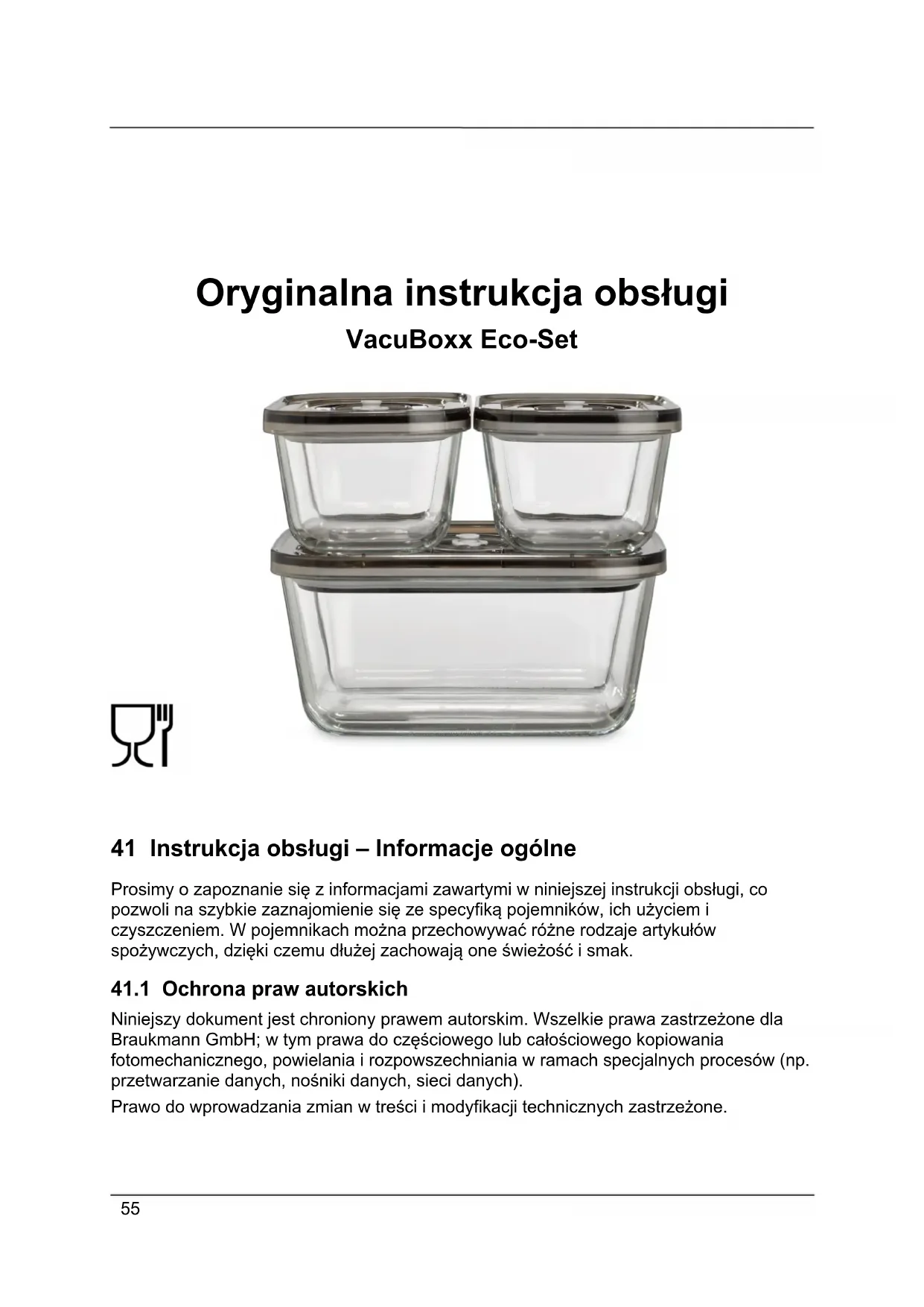 Niniejszy dokument jest chroniony prawem autorskim. Wszelkie prawa zastrzeżone dla Braukmann GmbH; w tym prawa do częściowego lub całościowego kopiowania fotomechanicznego, powielania i rozpowszechniania w ramach specjalnych procesów (np. przetwarzanie danych, nośniki danych, sieci danych). Prawo do wprowadzania zmian w treści i modyfikacji technicznych zastrzeżone.56 42 Zalecenia dotyczące bezpieczeństwa