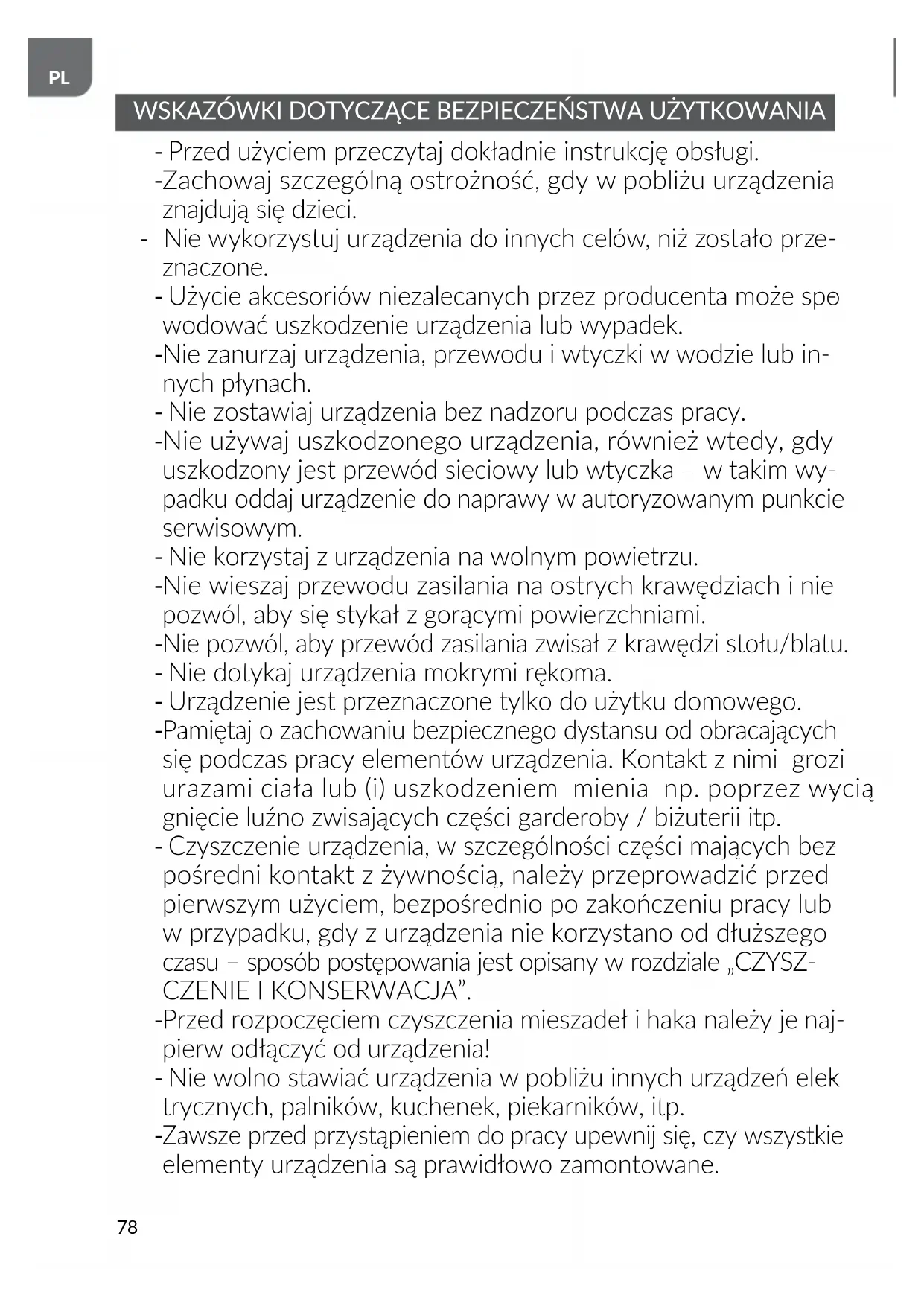 Nie zanurzaj urządzenia, przewodu i wtyczki w wodzie lub in- nych płynach. - Nie zostawiaj urządzenia bez nadzoru podczas pracy.