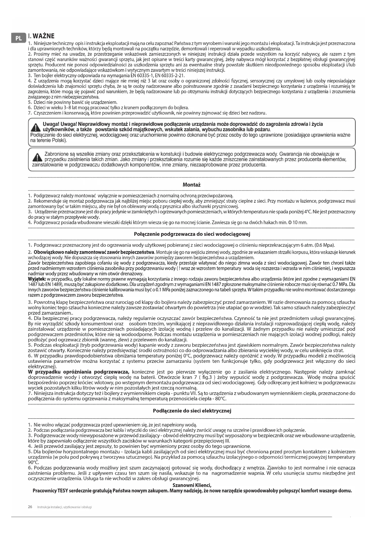 Przed włączeniem zasilania elektrycznego, należy upewnić się, że podgrzewacz jest napełniony wodąą. 3.1. Dla modeli wyposażonych w kabel z wytczką, podłączenie następuje wraz z włożeniem wtyczki do kontaktu sieci elektrycznej. Rozłączenie poprzez wyciągnięcie wtyczki z kontaktuj. Gniazdko wtyczkowe powinno być prawidłowo podłączone do odrębnego obwodu elektrycznego i zabezpieczonone bezpiecznikiem elektrycznym. Gniazdko należy koniecznie uziemić.28 Instrukcja instalacji, użytkowania i obsługi