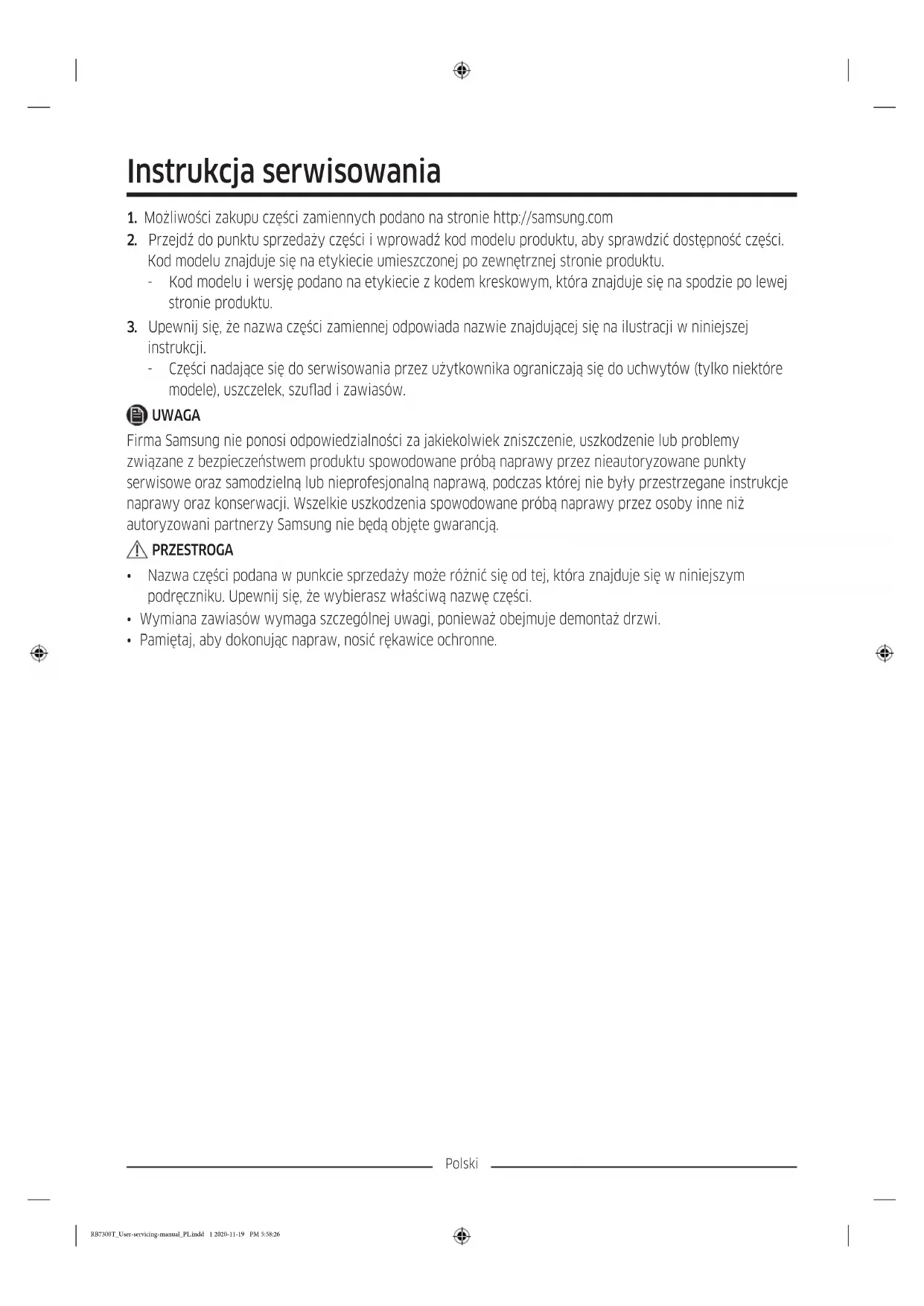- Pamiętaj, aby dokonując napraw, nosić rękawice ochronne. RB7300T_User-servicing-manual_PL.indd 1 2020-11-19 PM 5:58:26Polski Rzeczywisty wygląd i dostarczone elementy urządzenia mogą się różnić w zależności od modelu i kraju.