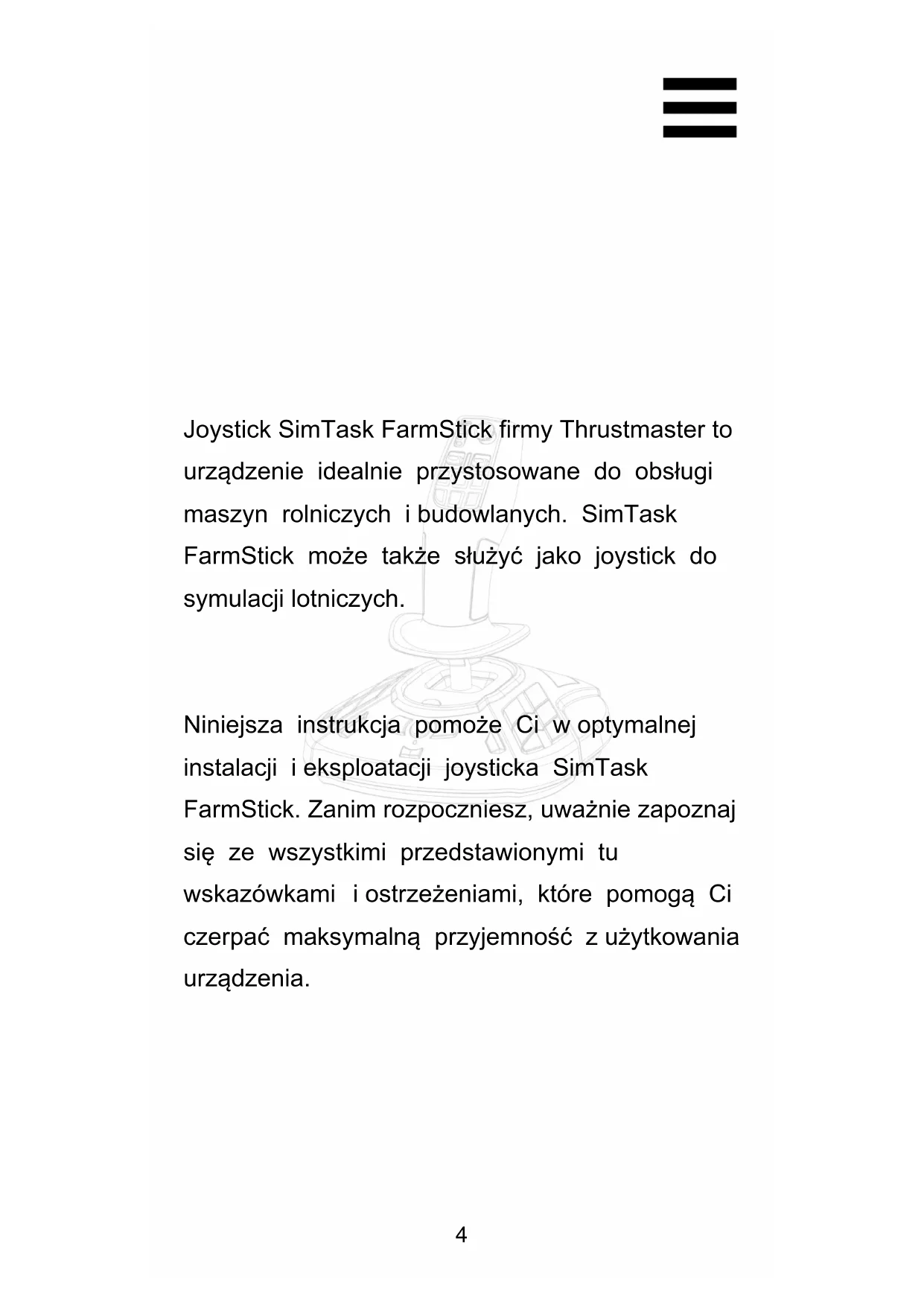 Niniejsza instrukcja pomoże Ci w optymalnej instalacji i eksploatacji joysticka SimTask FarmStick. Zanim rozpoczniesz, uważnie zapoznaj się ze wszystkimi przedstawionymi tu wskazówkami i ostrzeżeniami, które pomogą Ci czerpać maksymalną przyjemność z użytkowania urządzenia.5
