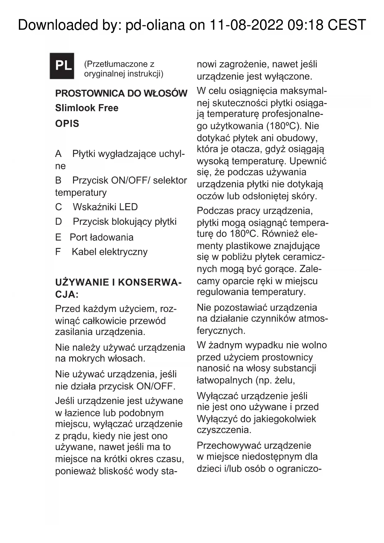 NIA: Wyłączyć urządzenie, naci- skając i przytrzymując przez 3 sekundy przycisk ON/OFF, aż dioda LED na wskaźniku zgaśnie. Przed odłożeniem prostow- nicy na miejsce przechowy- wania należy odczekać, aż ostygnie. Wyczyścić urządzenie. CZYSZCZENIE Odłączyć urządzenie z sieci i pozostawić aż do ochłodze- nia przed przystąpieniem do jakiegokolwiek czyszczenia. Przed czyszczeniem prostow- nicy upewniając się że płytki są zimne. Czyścić urządzenie wilgotną szmatką zmoczoną kilkoma kroplami płynu i następnie osuszyć. Nie używać do czyszczenia urządzenia rozpuszczalników, ani produktów z czynnikiem pH takich jak chlor, ani innych środków żrących. Nie dopuścić do przedostania się wody ni innej cieczy do otworów wentylacyjnych, aby uniknąć uszkodzeń części mechanicznych znajdujących się we wnętrzu urządzenia. Nie zanurzać urządzenia w wodzie ni innej cieczy, nie wkładać pod kran. Unikać możliwych rozprysków na urządzeniu lub kablu łączą- cym. Jeśli urządzenie nie jest utrzy- mywane w stanie czystości, jego powierzchnia może się zniszczyć i skrócić żywotność urządzenia i doprowadzić do niebezpiecznych sytuacji. Downloaded by: pd-oliana on 11-08-2022 09:18 CESTПРЕСА ЗА КОСА Slimlook Free