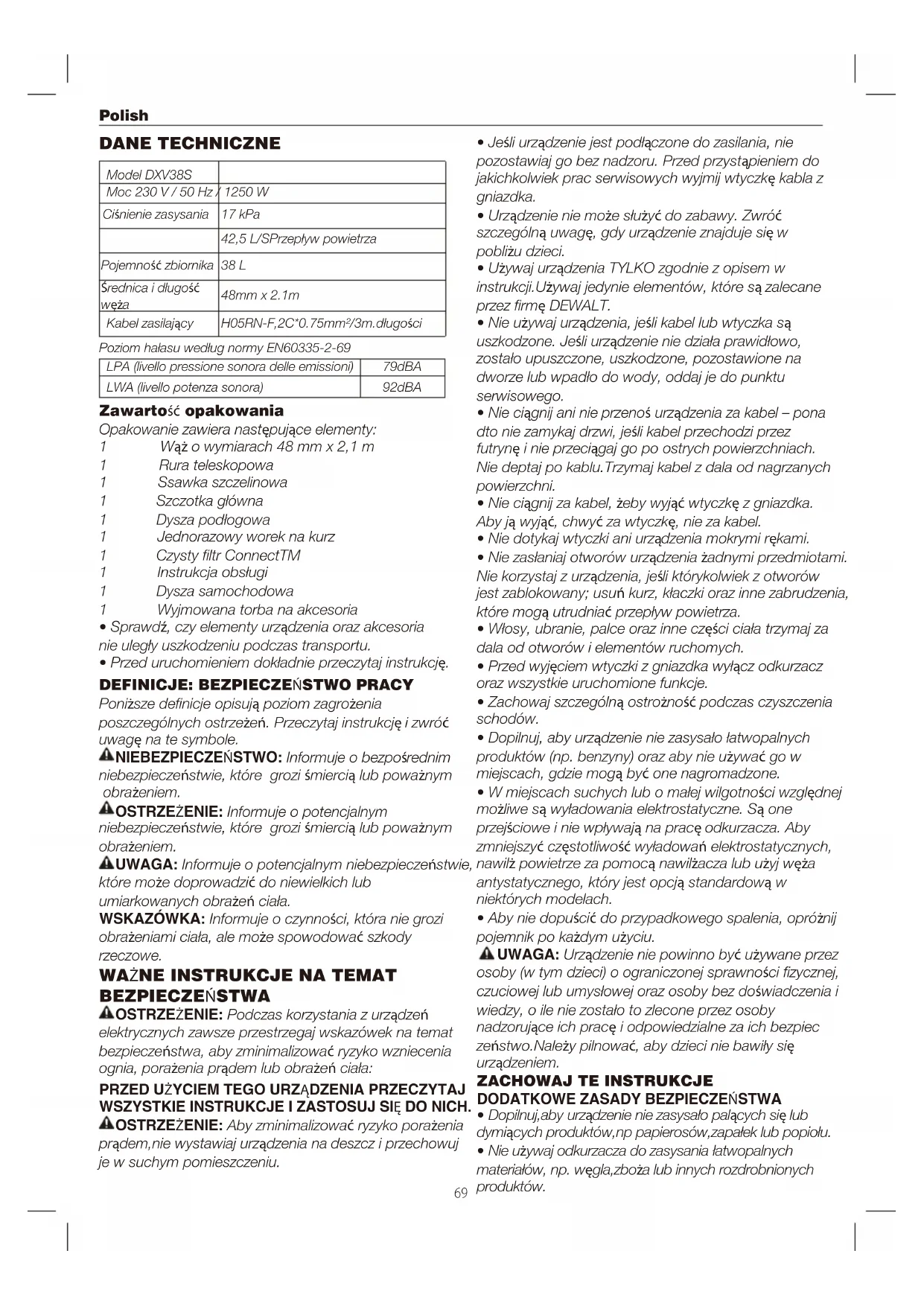 BEZPIECZEŃSTWA Moc 230 V / 50 Hz / 1250 W 17 kPa 38 L 48mm x 2.1m 79dBA H05RN-F,2C*0.75mm²/3m.długości Ciśnienie zasysania 42,5 L/SPrzepływ powietrza Pojemność zbiornika Średnica i długość węża LPA (livello pressione sonora delle emissioni) LWA (livello potenza sonora) 92dBA Kabel zasilający Poziom hałasu według normy EN60335-2-69 Poniższe denicje opisują poziom zagrożenia poszczególnych ostrzeżeń. Przeczytaj instrukcję i zwróć uwagę na te symbole. NIEBEZPIECZEŃSTWO: Informuje o bezpośrednim niebezpieczeństwie, które grozi śmiercią lub poważnym obrażeniem. OSTRZEŻENIE: Informuje o potencjalnym niebezpieczeństwie, które grozi śmiercią lub poważnym obrażeniem. UWAGA: Informuje o potencjalnym niebezpieczeństwie, które może doprowadzić do niewielkich lub umiarkowanych obrażeń ciała. WSKAZÓWKA: Informuje o czynności, która nie grozi obrażeniami ciała, ale może spowodować szkody rzeczowe. OSTRZEŻENIE: Podczas korzystania z urządzeń elektrycznych zawsze przestrzegaj wskazówek na temat bezpieczeństwa, aby zminimalizować ryzyko wzniecenia ognia, porażenia prądem lub obrażeń ciała: OSTRZEŻENIE: Aby zminimalizować ryzyko porażenia prądem,nie wystawiaj urządzenia na deszcz i przechowuj je w suchym pomieszczeniu. UWAGA: Urządzenie nie powinno być używane przez osoby (w tym dzieci) o ograniczonej sprawności zycznej, czuciowej lub umysłowej oraz osoby bez doświadczenia i wiedzy, o ile nie zostało to zlecone przez osoby nadzorujące ich pracę i odpowiedzialne za ich bezpiec zeństwo.Należy pilnować, aby dzieci nie bawiły się urządzeniem.