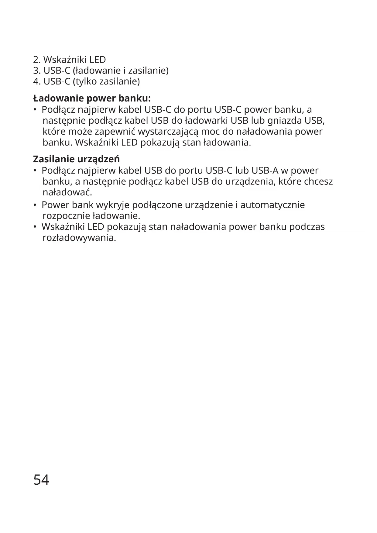 - Wskaźniki LED pokazują stan naładowania power banku podczas rozładowywania.55 Funkcjaprzyciskuzasilania(E2037) Tryb zasilania Brak działania Zakóńczenie zasilania Przełącz na tryb zasilania z małym prądem lub z powrotem do normalnego trybu zasilania Tryb ładowania USB-A jest gotowe do użycia. Brak działania Brak działania Tryb uśpienia Pokazuje za pomocą diody LED pozostałe ładowanie oraz informuje, że USB-A jest gotowe do użycia. Brak działania Brak działania Trybprądu Pojedyncze naciśnięcie Podwójne naciśnięcie Długie naciśnięcie Sprawdzeniestanunaładowania