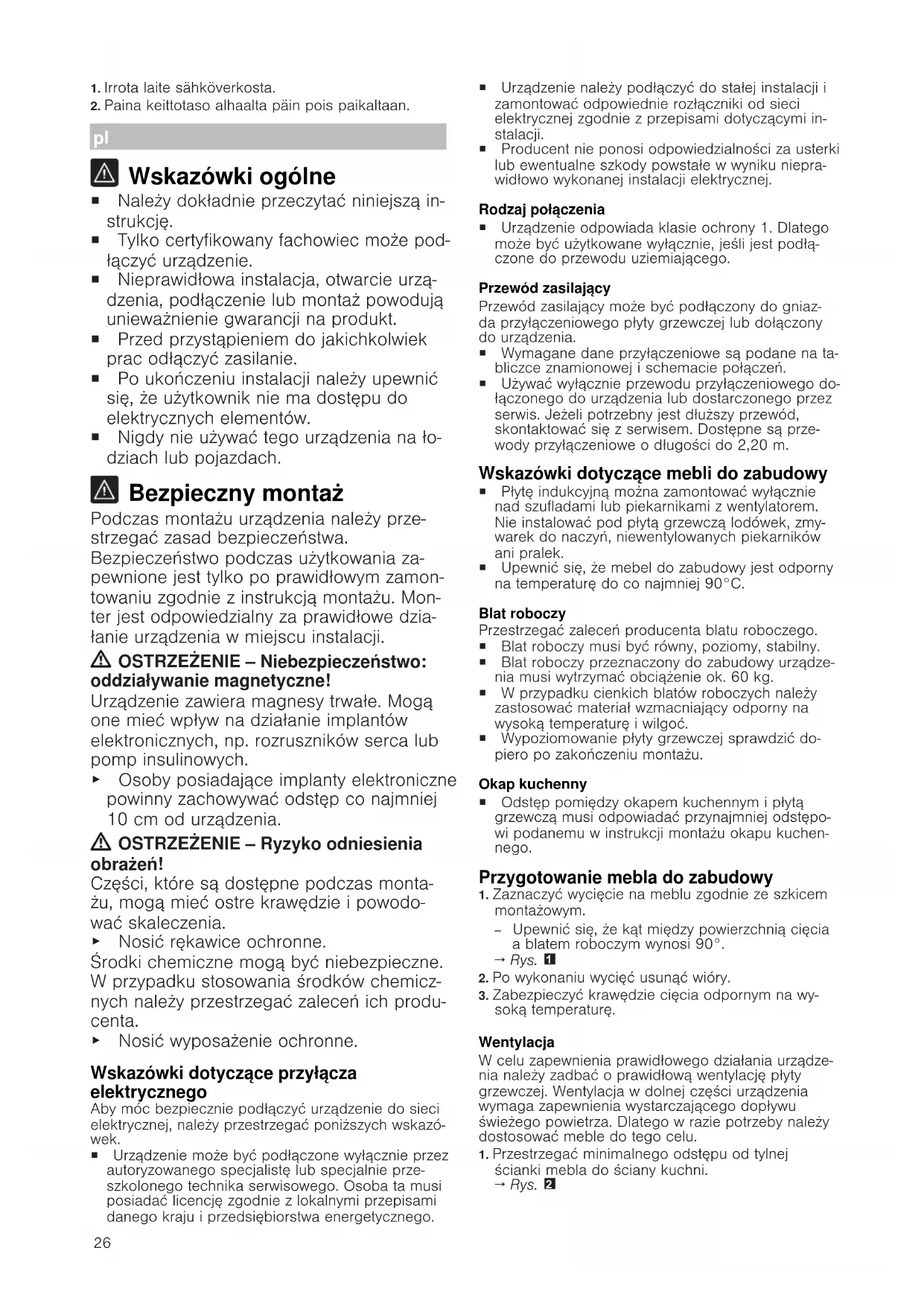 Wskazówki ogólne ¡ Należy dokładnie przeczytać niniejszą in- strukcję. ¡ Tylko certyfikowany fachowiec może pod- łączyć urządzenie. ¡ Nieprawidłowa instalacja, otwarcie urzą- dzenia, podłączenie lub montaż powodują unieważnienie gwarancji na produkt. ¡ Przed przystąpieniem do jakichkolwiek prac odłączyć zasilanie. ¡ Po ukończeniu instalacji należy upewnić się, że użytkownik nie ma dostępu do elektrycznych elementów. ¡ Nigdy nie używać tego urządzenia na ło- dziach lub pojazdach. Bezpieczny montaż Podczas montażu urządzenia należy prze- strzegać zasad bezpieczeństwa. Bezpieczeństwo podczas użytkowania za- pewnione jest tylko po prawidłowym zamon- towaniu zgodnie z instrukcją montażu. Mon- ter jest odpowiedzialny za prawidłowe dzia- łanie urządzenia w miejscu instalacji. OSTRZEŻENIE‒Niebezpieczeństwo: oddziaływanie magnetyczne! Urządzenie zawiera magnesy trwałe. Mogą one mieć wpływ na działanie implantów elektronicznych, np. rozruszników serca lub pomp insulinowych. ▶ Osoby posiadające implanty elektroniczne powinny zachowywać odstęp co najmniej 10cm od urządzenia. OSTRZEŻENIE‒Ryzyko odniesienia obrażeń! Części, które są dostępne podczas monta- żu, mogą mieć ostre krawędzie i powodo- wać skaleczenia. ▶ Nosić rękawice ochronne. Środki chemiczne mogą być niebezpieczne. W przypadku stosowania środków chemicz- nych należy przestrzegać zaleceń ich produ- centa. ▶ Nosić wyposażenie ochronne. Wskazówki dotyczące przyłącza elektrycznego Aby móc bezpiecznie podłączyć urządzenie do sieci elektrycznej, należy przestrzegać poniższych wskazó- wek. ¡ Urządzenie może być podłączone wyłącznie przez autoryzowanego specjalistę lub specjalnie prze- szkolonego technika serwisowego. Osoba ta musi posiadać licencję zgodnie z lokalnymi przepisami danego kraju i przedsiębiorstwa energetycznego. ¡ Urządzenie należy podłączyć do stałej instalacji i zamontować odpowiednie rozłączniki od sieci elektrycznej zgodnie z przepisami dotyczącymi in- stalacji. ¡ Producent nie ponosi odpowiedzialności za usterki lub ewentualne szkody powstałe w wyniku niepra- widłowo wykonanej instalacji elektrycznej. Rodzaj połączenia ¡ Urządzenie odpowiada klasie ochrony 1. Dlatego może być użytkowane wyłącznie, jeśli jest podłą- czone do przewodu uziemiającego. Przewód zasilający Przewód zasilający może być podłączony do gniaz- da przyłączeniowego płyty grzewczej lub dołączony do urządzenia. ¡ Wymagane dane przyłączeniowe są podane na ta- bliczce znamionowej i schemacie połączeń. ¡ Używać wyłącznie przewodu przyłączeniowego do- łączonego do urządzenia lub dostarczonego przez serwis. Jeżeli potrzebny jest dłuższy przewód, skontaktować się z serwisem. Dostępne są prze- wody przyłączeniowe o długości do 2,20m. Wskazówki dotyczące mebli do zabudowy ¡ Płytę indukcyjną można zamontować wyłącznie nad szufladami lub piekarnikami z wentylatorem. Nie instalować pod płytą grzewczą lodówek, zmy- warek do naczyń, niewentylowanych piekarników ani pralek. ¡ Upewnić się, że mebel do zabudowy jest odporny na temperaturę do co najmniej 90°C. Blat roboczy Przestrzegać zaleceń producenta blatu roboczego. ¡ Blat roboczy musi być równy, poziomy, stabilny. ¡ Blat roboczy przeznaczony do zabudowy urządze- nia musi wytrzymać obciążenie ok. 60kg. ¡ W przypadku cienkich blatów roboczych należy zastosować materiał wzmacniający odporny na wysoką temperaturę i wilgoć. ¡ Wypoziomowanie płyty grzewczej sprawdzić do- piero po zakończeniu montażu. Okap kuchenny ¡ Odstęp pomiędzy okapem kuchennym i płytą grzewczą musi odpowiadać przynajmniej odstępo- wi podanemu w instrukcji montażu okapu kuchen- nego. Przygotowanie mebla do zabudowy