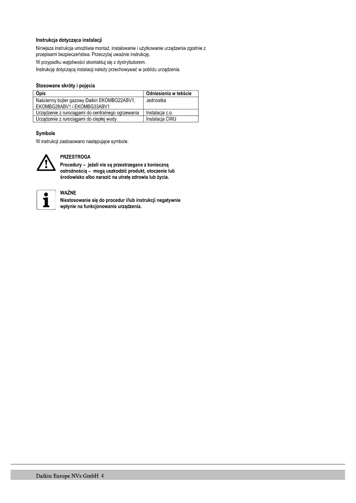 © 2022 Daikin Europe NVs Wszystkie prawa zastrzeżone. Informacje zawarte w niniejszej instrukcji dotyczą produktu w jego standardowej wersji. Daikin Europe NVs GmbH nie ponosi zatem odpowiedzialności za wszelkie szkody wynikłe ze specyfikacji produktu różniących się od wersji standardowej. Dostępne informacje opracowane zostały z najwyższą dbałością o szczegóły, jednak Daikin Europe NVs nie ponosi odpowiedzialności za wszelkie błędy w nich zawarte oraz ich konsekwencje. Daikin Europe NVs nie ponosi odpowiedzialności za żadne szkody wynikłe z prac przeprowadzanych przez osoby trzecie. Zastrzega się możliwość zmian.Daikin Europe NVs GmbH 4 Instrukcja dotycząca instalacji Niniejsza instrukcja umożliwia montaż, instalowanie i użytkowanie urządzenia zgodnie z przepisami bezpieczeństwa. Przeczytaj uważnie instrukcję. W przypadku wątpliwości skontaktuj się z dystrybutorem. Instrukcję dotyczącą instalacji należy przechowywać w pobliżu urządzenia. Stosowane skróty i pojęcia Opis Odniesienia w tekście Naścienny bojler gazowy Daikin EKOMBG22ABV1, EKOMBG28ABV1 i EKOMBG33ABV1 Jednostka Urządzenie z rurociągami do centralnego ogrzewania Instalacja c.o. Urządzenie z rurociągami do ciepłej wody Instalacja CWU