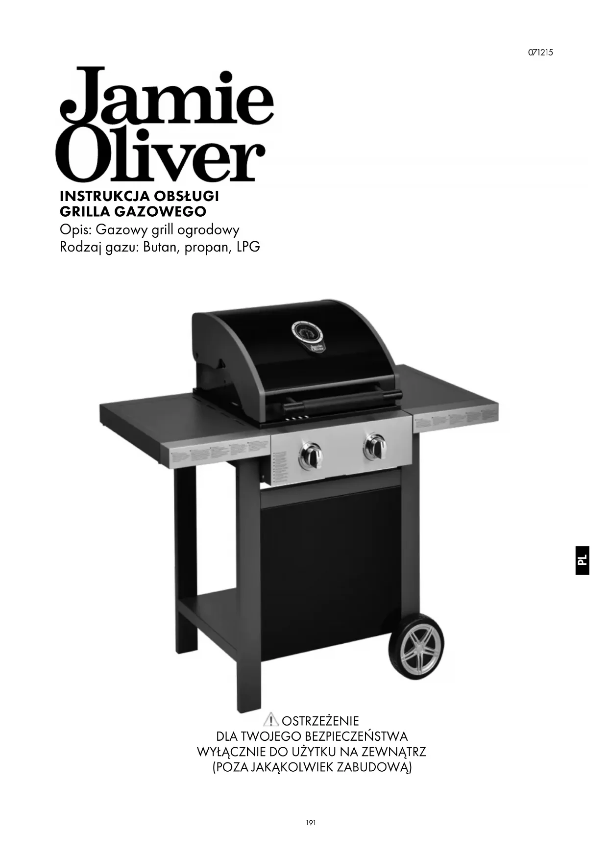 Należy uważnie przeczytać niniejszą instrukcję oraz upewnić się, że grill jest zainstalowany, zmontowany, utrzymywany i serwisowany zgodnie z zaleceniami niniejszej instrukcji. Niezastosowanie się do niniejszej instrukcji może być przyczyną poważnych obrażeń ciała i / lub szkód materialnych. W przypadku jakiekolwiek pytań dotyczących montażu lub obsługi grilla prosimy o kontakt ze sprzedawcą, dostawcą gazu, producentem, przedstawicielem lub pod adresem www. jamieoliverbbq.com. Uwagi dla użytkownika: „WYŁĄCZNIE DO UŻYTKU NA ZEWNĄTRZ” „NALEŻY ZAPOZNAĆ SIĘ Z INSTRUKCJĄ PRZED UŻYCIEM URZĄDZENIA” „OSTRZEŻENIE: DOSTĘPNE ELEMENTY GRILLA MOGĄ BYĆ BARDZO GORĄCE. TRZYMAJ DZIECI Z DALA OD URZĄDZENIA”. „NIE PORUSZAJ URZĄDZENIA PODCZAS UŻYTKOWANIA”. „ODŁĄCZ DOPŁYW GAZU NA BUTLI GAZU PO ZAKOŃCZENIU UŻYTKOWANIA.” INFORMACJE TECHNICZNE MODEL NR HOME 2 (2 palniki) OPIS: GRILL OGRODOWY CZTEROPALNIKOWY Z PALNIKIEM BOCZNYM CAŁKOWITA MOC CIEPLNA: (WSZYSTKIE KATEGORIE GAZU) 7.2kW (515g/h) KATEGORIA GAZU: