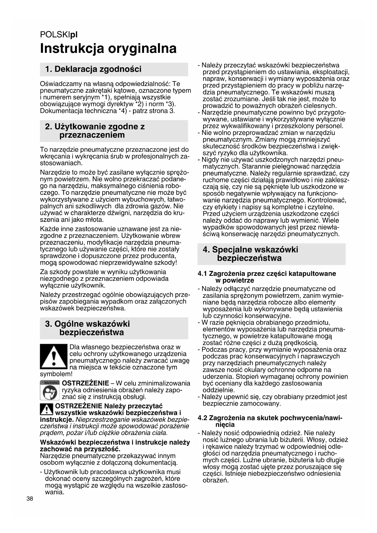 Instrukcja oryginalna Oświadczamy na własną odpowiedzialność: Te pneumatyczne zakrętaki kątowe, oznaczone typem i numerem seryjnym *1), spełniają wszystkie obowiązujące wymogi dyrektyw *2) i norm *3). Dokumentacja techniczna *4) - patrz strona 3. To narzędzie pneumatyczne przeznaczone jest do wkręcania i wykręcania śrub w profesjonalnych za- stosowaniach. Narzędzie to może być zasilane wyłącznie sprężo- nym powietrzem. Nie wolno przekraczać podane- go na narzędziu, maksymalnego ciśnienia robo- czego. To narzędzie pneumatyczne nie może być wykorzystywane z użyciem wybuchowych, łatwo- palnych ani szkodliwych dla zdrowia gazów. Nie używać w charakterze dźwigni, narzędzia do kru- szenia ani jako młota. Każde inne zastosowanie uznawane jest za nie- zgodne z przeznaczeniem. Użytkowanie wbrew przeznaczeniu, modyfikacje narzędzia pneuma- tycznego lub używanie części, które nie zostały sprawdzone i dopuszczone przez producenta, mogą spowodować nieprzewidywalne szkody! Za szkody powstałe w wyniku użytkowania niezgodnego z przeznaczeniem odpowiada wyłącznie użytkownik. Należy przestrzegać ogólnie obowiązujących prze- pisów zapobiegania wypadkom oraz załączonych wskazówek bezpieczeństwa. Dla własnego bezpieczeństwa oraz w celu ochrony użytkowanego urządzenia pneumatycznego należy zwracać uwagę na miejsca w tekście oznaczone tym symbolem! OSTRZEŻENIE – W celu zminimalizowania ryzyka odniesienia obrażeń należy zapo- znać się z instrukcją obsługi. OSTRZEŻENIE Należy przeczytać wszystkie wskazówki bezpieczeństwa i instrukcje. Nieprzestrzeganie wskazówek bezpie- czeństwa i instrukcji może spowodować porażenie prądem, pożar i/lub ciężkie obrażenia ciała. Wskazówki bezpieczeństwa i instrukcje należy zachować na przyszłość. Narzędzie pneumatyczne przekazywać innym osobom wyłącznie z dołączoną dokumentacją. - Użytkownik lub pracodawca użytkownika musi dokonać oceny szczególnych zagrożeń, które mogą wystąpić ze względu na wszelkie zastoso- wania. - Należy przeczytać wskazówki bezpieczeństwa przed przystąpieniem do ustawiania, eksploatacji, napraw, konserwacji i wymiany wyposażenia oraz przed przystąpieniem do pracy w pobliżu narzę- dzia pneumatycznego. Te wskazówki muszą zostać zrozumiane. Jeśli tak nie jest, może to prowadzić to poważnych obrażeń cielesnych. - Narzędzie pneumatyczne powinno być przygoto- wywane, ustawiane i wykorzystywane wyłącznie przez wykwalifikowany i przeszkolony personel. - Nie wolno przeprowadzać zmian w narzędziu pneumatycznym. Zmiany mogą zmniejszyć skuteczność środków bezpieczeństwa i zwięk- szyć ryzyko dla użytkownika. - Nigdy nie używać uszkodzonych narzędzi pneu- matycznych. Starannie pielęgnować narzędzia pneumatyczne. Należy regularnie sprawdzać, czy ruchome części działają prawidłowo i nie zaklesz- czają się, czy nie są pęknięte lub uszkodzone w sposób negatywnie wpływający na funkcjono- wanie narzędzia pneumatycznego. Kontrolować, czy etykiety i napisy są kompletne i czytelne. Przed użyciem urządzenia uszkodzone części należy oddać do naprawy lub wymienić. Wiele wypadków spowodowanych jest przez niewła- ściwą konserwację narzędzi pneumatycznych.