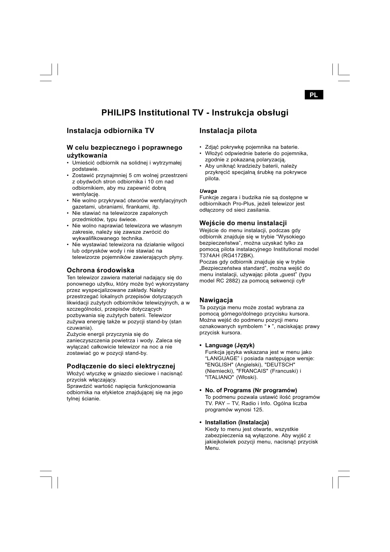 PHILIPS Institutional TV - Instrukcja obs³ugi Instalacja odbiornika TV Instalacja pilota W celu bezpiecznego i poprawnego u¿ytkowania Zdj¹æ pokrywkê pojemnika na baterie. W³o¿yæ odpwiednie baterie do pojemnika, zgodnie z pokazan¹ polaryzacj¹. Aby unikn¹æ kradzie¿y baterii, nale¿y przykrêciæ specjaln¹ rubkê na pokrywce pilota. Umieciæ odbiornik na solidnej i wytrzyma³ej podstawie. Zostawiæ przynajmniej 5 cm wolnej przestrzeni z obydwóch stron odbiornika i 10 cm nad odbiornikiem, aby mu zapewniæ dobr¹ wentylacjê. Nie wolno przykrywaæ otworów wentylacyjnych gazetami, ubraniami, firankami, itp. Nie stawiaæ na telewizorze zapalonych przedmiotów, typu wiece. Nie wolno naprawiaæ telewizora we w³asnym zakresie, nale¿y siê zawsze zwróciæ do wykwalifikowanego technika. Nie wystawiaæ telewizora na dzia³anie wilgoci lub odprysków wody i nie stawiaæ na telewizorze pojemników zawieraj¹cych p³yny. Ochrona rodowiska Ten telewizor zawiera materia³ nadaj¹cy siê do ponownego u¿ytku, który mo¿e byæ wykorzystany przez wyspecjalizowane zak³ady. Nale¿y przestrzegaæ lokalnych przepisów dotycz¹cych likwidacji zu¿ytych odbiorników telewizyjnych, a w szczególnoci, przepisów dotycz¹cych pozbywania siê zu¿ytych baterii. Telewizor zu¿ywa energiê tak¿e w pozycji stand-by (stan czuwania). Zu¿ycie energii przyczynia siê do zanieczyszczenia powietrza i wody. Zaleca siê wy³¹czaæ ca³kowicie telewizor na noc a nie zostawiaæ go w pozycji stand-by. Pod³¹czenie do sieci elektrycznej W³o¿yæ wtyczkê w gniazdo sieciowe i nacisn¹æ przycisk w³¹czaj¹cy. Sprawdziæ wartoæ napiêcia funkcjonowania odbiornika na etykietce znajduj¹cej siê na jego tylnej cianie. Uwaga Funkcje zegara i budzika nie s¹ dostêpne w odbiornikach Pro-Plus, je¿eli telewizor jest od³¹czony od sieci zasilania. Wejcie do menu instalacji Wejcie do menu instalacji, podczas gdy odbiornik znajduje siê w trybie Wysokiego bezpieczeñstwa, mo¿na uzyskaæ tylko za pomoc¹ pilota instalacyjnego Institutional model T374AH (RG4172BK). Poczas gdy odbiornik znajduje siê w trybie Bezpieczeñstwa standard, mo¿na wejæ do menu instalacji, u¿ywaj¹c pilota guest (typu model RC 2882) za pomoc¹ sekwencji cyfr Nawigacja Ta pozycja menu mo¿e zostaæ wybrana za pomoc¹ górnego/dolnego przycisku kursora. Mo¿na wejæ do podmenu pozycji menu oznakowanych symbolem ", naciskaj¹c prawy przycisk kursora. Language (Jêzyk) Funkcja jêzyka wskazana jest w menu jako LANGUAGE i posiada nastêpuj¹ce wersje: "ENGLISH" (Angielski), "DEUTSCH" (Niemiecki), "FRANCAIS" (Francuski) i "ITALIANO" (W³oski). No. of Programs (Nr programów) To podmenu pozwala ustawiæ iloæ programów TV. PAY TV, Radio i Info. Ogólna liczba programów wynosi 125. Installation (Instalacja) Kiedy to menu jest otwarte, wszystkie zabezpieczenia s¹ wy³¹czone. Aby wyjæ z jakiejkolwiek pozycji menu, nacisn¹æ przycisk Menu. Input (Wejcie) Pozycja menu Input pozwala na wybranie ¿¹danego ród³a wejcia, które zostanie nadane programowi. Istniej¹ nastêpuj¹ce mo¿liwoci: Antena (wyjcie przednie), AV1, AV2 i AV2YC (interface wewnêtrzny, tylko dla TV system) i RADIO. System WEST EU (PAL/SECAM-BG) i EAST EU (PAL/ SECAM-DK), UK (PAL-I), FRANCE (SECAM-L/L'). Manual Search (Strojenie rêczne) Aby okreliæ czêstotliwoæ w MHz, mo¿na wprowadziæ cyfry. Prawy kursor uruchamia wyszukiwanie automatyczne; podczas wprowadzania czêstotliwoci cyfry, które nie zosta³y jeszcze wprowadzone s¹ wywietlane w postaci mylników -" . Wprowadziæ 0 w przypadku czêstotliwoci ni¿szych od 100 MHz. Program no. (Numer programu) Rodzaj programu mo¿na wybraæ za pomoc¹ lewego/prawego przycisku kursora. Tymi przyciskami mo¿na prze³¹czaæ pomiêdzy wszystkimi dostêpnymi programami: TV", INFO", PAY-TV" i RADIO". Je¿eli numer programu danego typu wynosi 0 oznacza to, ¿e odpowiadaj¹cy mu typ programu nie zostanie wywietlony. W celu wywietlenia numeru programu w wy¿ej wymienionych przypadkach, nale¿y zawsze wprowadziæ dwie cyfry, np. 01 dla TV1 lub cyfrê 1 i u¿yæ górnego/dolnego kursora. Store (Zapamiêtanie) Bie¿¹ce informacje programu zostaj¹ zapamiêtane naciskaj¹c prawy/lewy przycisk kursora. Nacisn¹æ Menu, aby wyjæ bez zapisania w pamiêci. Fine Tune (Dok³adne dostrojenie) Za pomoc¹ polecenia sterowanie lewe/prawe, zostaje uruchomione dok³adne dostrojenie. Protection (Zabezpieczenie) Ta funkcja wskazuje czy wybrany program jest zabezpieczony. Za pomoc¹ lewego/prawego przycisku kursora mo¿na prze³¹czyæ zabezpieczenie z YES (TAK) na NO (NIE). Label (Etykieta) Za pomoc¹ tej pozycji menu mo¿na dodaæ etykietê/nazwê ka¿demu z programów. Aby wejæ lub wyjæ z pola etykiety, nale¿y nacisn¹æ prawy/lewy przycisk; naciskaj¹c natomiast górny/dolny przycisk kursora, mo¿na wprowadziæ znaki literowo-cyfrowe. Nacisn¹æ M (przycisk Menu), aby wyjæ z menu Etykieta. Teletext Language (Jêzyk Teletegazeta) To menu pozwala u¿ytkownikowi wybraæ komplet znaków teletegazety do zastosowania dla wybranego kana³u. U¿ywaj¹c prawego/lewego przycisku kursora mo¿na wybraæ literê odpowiadaj¹c¹ ró¿nym grupom jêzykowym: W: Pan Europeo (Latin) / opcja West (zachodni) E: Pan Europeo (Latin) / opcja East (wschodni) G: Grecki A: Arabski C: Cyrylicki Video Blank (Brak obrazu) Tê pozycjê menu mo¿na prze³¹czyæ z YES na NO w celu zawiecenia lub wygaszenia obrazu. Audio Mute (Wy³¹czenie dwiêku) Tê pozycjê menu mo¿na prze³¹czyæ z YES na NO w celu w³¹czenia lub wy³¹czenia dwiêku. Uwagi TV górny/dolny, INFO górny/dolny, PAY-TV górny/dolny i RADIO górny/dolny funkcjonuj¹ w trybie menu a telewizor zachowuje siê tak samo jak w trybie TV. Clock set-up (Nastawienie zegara) Z tej pozycji menu mo¿na wejæ do menu nastawienia zegara. Faktycznie wywietlane pozycje menu zale¿¹ od obecnoci wywietlacza z diod¹ LED zegara. Display (Wywietlacz) (tylko OSD) Okrela czy na ekranie zostaje wywietlony dok³adny czas. Displ