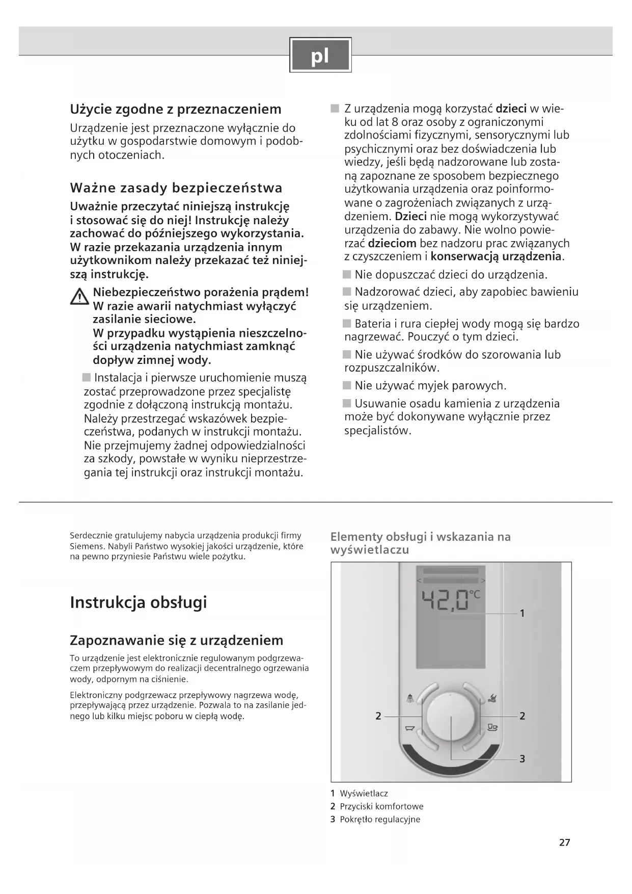 Użycie zgodne z przeznaczeniem Urządzenie jest przeznaczone wyłącznie do użytku w gospodarstwie domowym i podob- nych otoczeniach. Ważne zasady bezpieczeństwa Uważnie przeczytać niniejszą instrukcję i stosować się do niej! Instrukcję należy zachować do późniejszego wykorzystania. W razie przekazania urządzenia innym użytkownikom należy przekazać też niniej- szą instrukcję. Niebezpieczeństwo porażenia prądem! W razie awarii natychmiast wyłączyć zasilanie sieciowe. W przypadku wystąpienia nieszczelno- ści urządzenia natychmiast zamknąć dopływ zimnej wody. ■ Instalacja i pierwsze uruchomienie muszą zostać przeprowadzone przez specjalistę zgodnie z dołączoną instrukcją montażu. Należy przestrzegać wskazówek bezpie- czeństwa, podanych w instrukcji montażu. Nie przejmujemy żadnej odpowiedzialności za szkody, powstałe w wyniku nieprzestrze- gania tej instrukcji oraz instrukcji montażu. ■ Z urządzenia mogą korzystać dzieci w wie- ku od lat 8 oraz osoby z ograniczonymi zdolnościami fizycznymi, sensorycznymi lub psychicznymi oraz bez doświadczenia lub wiedzy, jeśli będą nadzorowane lub zosta- ną zapoznane ze sposobem bezpiecznego użytkowania urządzenia oraz poinformo- wane o zagrożeniach związanych z urzą- dzeniem. Dzieci nie mogą wykorzystywać urządzenia do zabawy. Nie wolno powie- rzać dzieciom bez nadzoru prac związanych z czyszczeniem i konserwacją urządzenia. ■ Nie dopuszczać dzieci do urządzenia. ■ Nadzorować dzieci, aby zapobiec bawieniu się urządzeniem. ■ Bateria i rura ciepłej wody mogą się bardzo nagrzewać. Pouczyć o tym dzieci. ■ Nie używać środków do szorowania lub rozpuszczalników. ■ Nie używać myjek parowych. ■ Usuwanie osadu kamienia z urządzenia może być dokonywane wyłącznie przez specjalistów. Serdecznie gratulujemy nabycia urządzenia produkcji firmy Siemens. Nabyli Państwo wysokiej jakości urządzenie, które na pewno przyniesie Państwu wiele pożytku. Instrukcja obsługi Zapoznawanie się z urządzeniem To urządzenie jest elektronicznie regulowanym podgrzewa-czem przepływowym do realizacji decentralnego ogrzewania wody, odpornym na ciśnienie.Elektroniczny podgrzewacz przepływowy nagrzewa wodę, przepływającą przez urządzenie. Pozwala to na zasilanie jed-nego lub kilku miejsc poboru w ciepłą wodę. Elementy obsługi i wskazania na wyświetlaczu