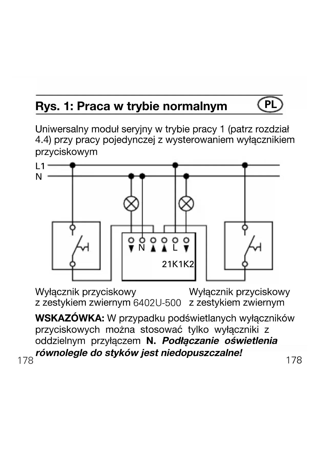 WSKAZÓWKA: W przypadku podświetlanych wyłączników przyciskowych要去 stosowej tylko wyłączniki z oddzielnym przyȩczem N. Podȩczanie oświetzenia równelegle do styków jest niedopuszczalne!