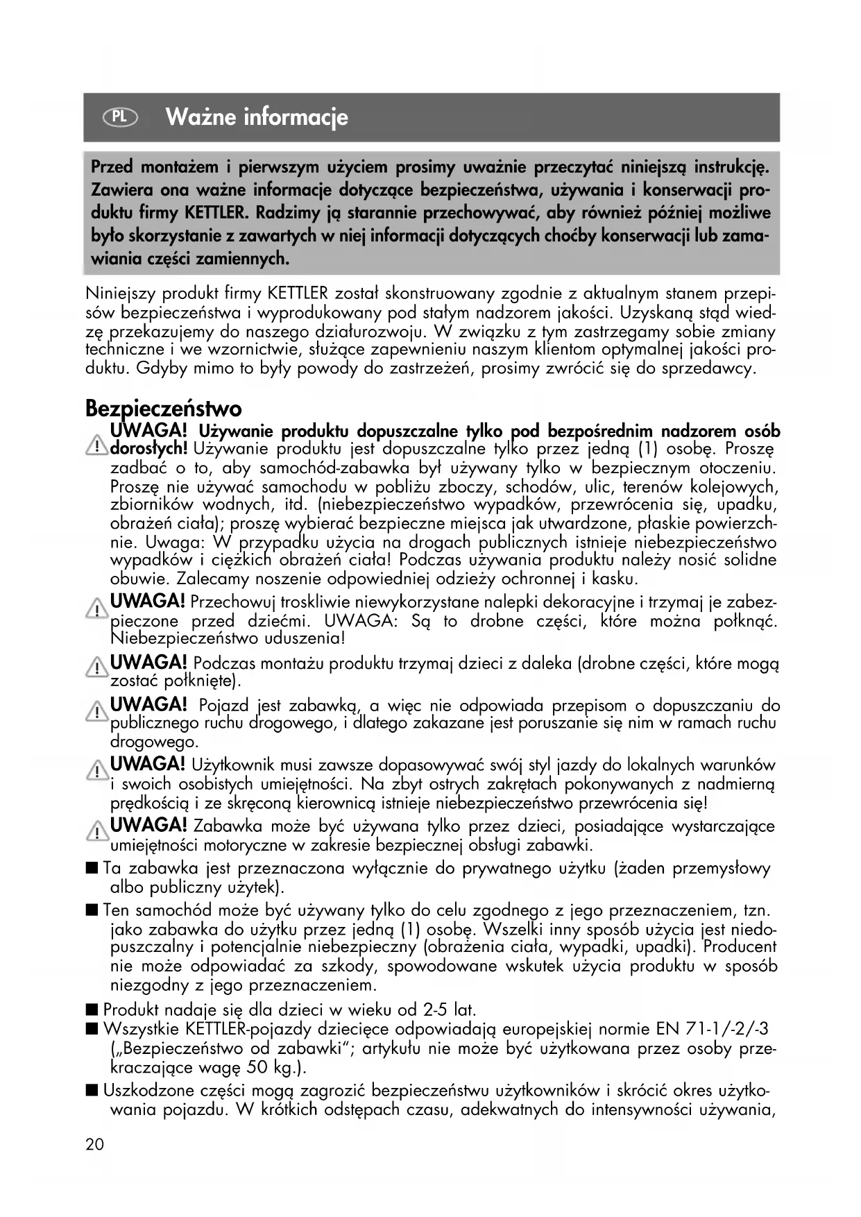 I CH20 Ważne informacje Przed montażem i pierwszym użyciem prosimy uważnie przeczytać niniejszą instrukcję. Zawiera ona ważne informacje dotyczące bezpieczeństwa, używania i konserwacji pro- duktu firmy KETTLER. Radzimy ją starannie przechowywać, aby również później możliwe było skorzystanie z zawartych w niej informacji dotyczących choćby konserwacji lub zama- wiania części zamiennych. Niniejszy produkt firmy KETTLER został skonstruowany zgodnie z aktualnym stanem przepi- sów bezpieczeństwa i wyprodukowany pod stałym nadzorem jakości. Uzyskaną stąd wied- zę przekazujemy do naszego działurozwoju. W związku z tym zastrzegamy sobie zmiany techniczne i we wzornictwie, służące zapewnieniu naszym klientom optymalnej jakości pro- duktu. Gdyby mimo to były powody do zastrzeżeń, prosimy zwrócić się do sprzedawcy. Bezpieczeństwo UWAGA! Używanie produktu dopuszczalne tylko pod bezpośrednim nadzorem osób dorosłych! Używanie produktu jest dopuszczalne tylko przez jedną (1) osobę. Proszę zadbać o to, aby samochód-zabawka był używany tylko w bezpiecznym otoczeniu. Proszę nie używać samochodu w pobliżu zboczy, schodów, ulic, terenów kolejowych, zbiorników wodnych, itd. (niebezpieczeństwo wypadków, przewrócenia się, upadku, obrażeń ciała); proszę wybierać bezpieczne miejsca jak utwardzone, płaskie powierzch- nie. Uwaga: W przypadku użycia na drogach publicznych istnieje niebezpieczeństwo wypadków i ciężkich obrażeń ciała! Podczas używania produktu należy nosić solidne obuwie. Zalecamy noszenie odpowiedniej odzieży ochronnej i kasku. UWAGA! Przechowuj troskliwie niewykorzystane nalepki dekoracyjne i trzymaj je zabez- pieczone przed dziećmi. UWAGA: Są to drobne części, które można połknąć. Niebezpieczeństwo uduszenia! UWAGA! Podczas montażu produktu trzymaj dzieci z daleka (drobne części, które mogą zostać połknięte). UWAGA! Pojazd jest zabawką, a więc nie odpowiada przepisom o dopuszczaniu do publicznego ruchu drogowego, i dlatego zakazane jest poruszanie się nim w ramach ruchu drogowego. UWAGA! Użytkownik musi zawsze dopasowywać swój styl jazdy do lokalnych warunków i swoich osobistych umiejętności. Na zbyt ostrych zakrętach pokonywanych z nadmierną prędkością i ze skręconą kierownicą istnieje niebezpieczeństwo przewrócenia się! UWAGA! Zabawka może być używana tylko przez dzieci, posiadające wystarczające umiejętności motoryczne w zakresie bezpiecznej obsługi zabawki. ■ Ta zabawka jest przeznaczona wyłącznie do prywatnego użytku (żaden przemysłowy albo publiczny użytek). ■ Ten samochód może być używany tylko do celu zgodnego z jego przeznaczeniem, tzn. jako zabawka do użytku przez jedną (1) osobę. Wszelki inny sposób użycia jest niedo- puszczalny i potencjalnie niebezpieczny (obrażenia ciała, wypadki, upadki). Producent nie może odpowiadać za szkody, spowodowane wskutek użycia produktu w sposób niezgodny z jego przeznaczeniem. ■ Produkt nadaje się dla dzieci w wieku od 2-5 lat. ■ Wszystkie KETTLER-pojazdy dziecięce odpowiadają europejskiej normie EN 71-1/-2/-3 („Bezpieczeństwo od zabawki“; artykułu nie może być użytkowana przez osoby prze- kraczające wagę 50 kg.). ■ Uszkodzone części mogą zagrozić bezpieczeństwu użytkowników i skrócić okres użytko- wania pojazdu. W krótkich odstępach czasu, adekwatnych do intensywności używania,
