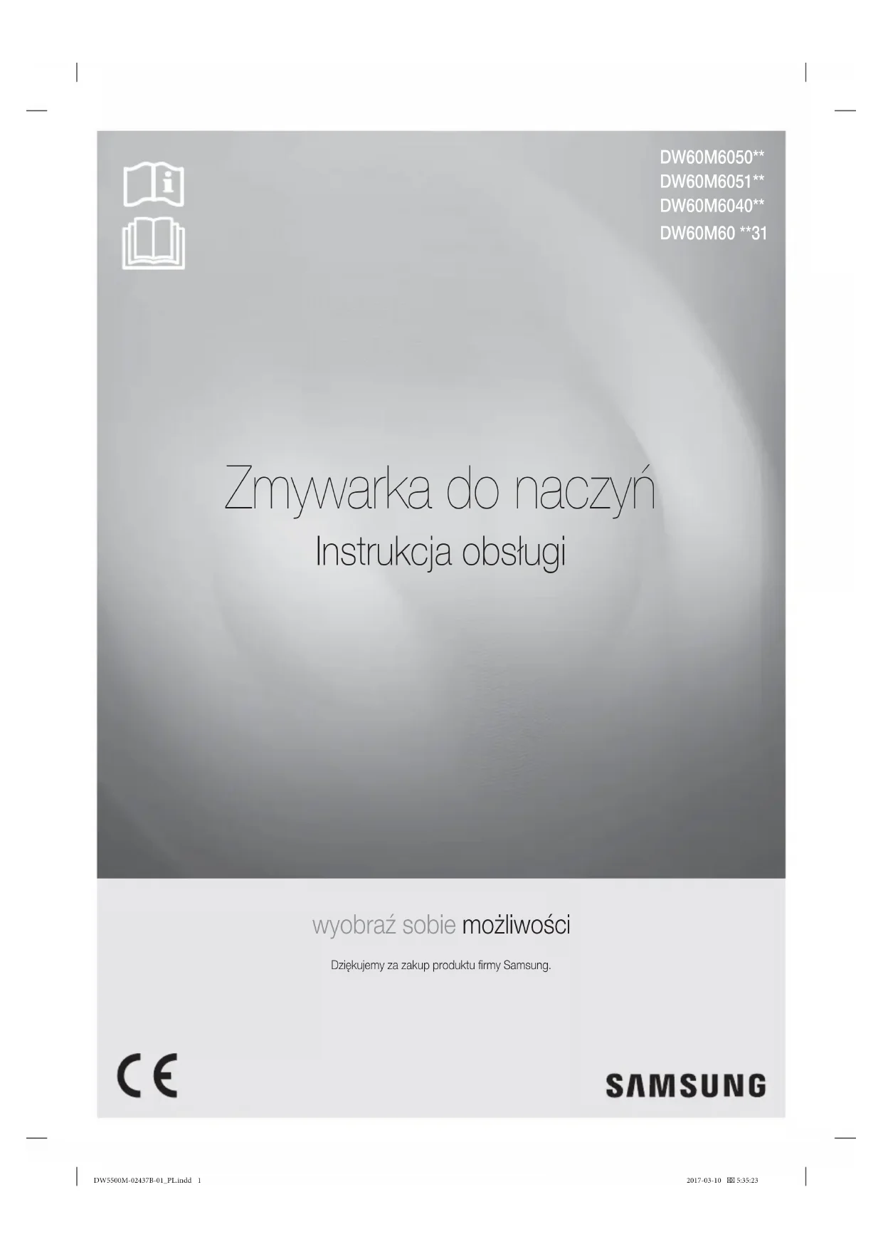 www.samsung.com/be/support (Dutch) www.samsung.com/be_fr/support (French) DENMARK 707 019 70 www.samsung.com/dk/support FINLAND 030-6227 515 www.samsung.com//support FRANCE 01 48 63 00 00 www.samsung.com/fr/support GERMANY 06196 77 555 77 www.samsung.com/de/support ITALIA 800-SAMSUNG (800.7267864) www.samsung.com/it/support CYPRUS 8009 4000 only from landline, toll free www.samsung.com/gr/support GREECE 80111-SAMSUNG (80111 726 7864) only from land line (+30) 210 6897691 from mobile and land line www.samsung.com/gr/support LUXEMBURG 261 03 710 www.samsung.com/be_fr/support NETHERLANDS 088 90 90 100 www.samsung.com/nl/support NORWAY 21629099 www.samsung.com/no/support PORTUGAL 808 207 267 www.samsung.com/pt/support SPAIN 91 175 00 15 www.samsung.com/es/support SWEDEN 0771-400 300 www.samsung.com/se/support SWITZERLAND 0800 726 786 www.samsung.com/ch/support (German) www.samsung.com/ch_fr/support (French) UK 0333 000 0333 www.samsung.com/uk/support IRELAND (EIRE) 0818 717100 www.samsung.com/ie/support 5DW60M6050** DW60M6051** DW60M6040** Zmywarka do naczyń Instrukcja obsługi wyobraź sobie możliwości Dziękujemy za zakup produktu firmy Samsung. DW5500M-02437B-00_PL.indd 1DW5500M-02437B-0 _PL.indd 1 2017-03-10 5:35:232017-03-10 5:35:231 DW60M60 **312_ Zasady bezpieczeństwa Instrukcje bezpieczeństwa Gratulujemy zakupu nowej zmywarki do naczyń firmy Samsung. Niniejsza instrukcja zawiera ważne informacje dotyczące montażu, użytkowania i konserwacji urządzenia. Prosimy o poświęcenie czasu na przeczytanie niniejszej instrukcji. Zawarte w niej informacje pozwalają optymalnie wykorzystać bogactwo zalet i funkcji zmywarki do naczyń. CO TRZEBA WIEDZIEĆ O ZASADACH BEZPIECZEŃSTWA Prosimy o dokładne przeczytanie niniejszej instrukcji w celu uzyskania wiedzy na temat bezpiecznego i efektywnego korzystania z rozlicznych zalet i funkcji nowego urządzenia. Instrukcję należy zachować do wglądu i przechowywać w bezpiecznym miejscu w pobliżu urządzenia. Urządzenia należy używać wyłącznie w celu, do którego zostało ono wyprodukowane, w sposób zgodny z niniejszą instrukcją obsługi. Ostrzeżenia i zasady bezpieczeństwa zawarte w niniejszej instrukcji nie wyczerpują wszystkich możliwych warunków i sytuacji. Użytkownik jest odpowiedzialny za zachowanie zdrowego rozsądku i ostrożności podczas montażu, konserwacji i obsługi zmywarki do naczyń. Ponieważ zawarte poniżej informacje dotyczące obsługi odnoszą się do różnych modeli, charakterystyka zakupionej zmywarki do naczyń może nieznacznie odbiegać od opisu zawartego w instrukcji. Część ostrzeżeń może nie mieć zastosowania. W razie pytań lub wątpliwości należy skontaktować się z najbliższym centrum serwisowym lub poszukać pomocy i informacji w witrynie www.samsung.com. WAŻNE SYMBOLE I ZASADY DOTYCZĄCE BEZPIECZEŃSTWA Ważne symbole dotyczące bezpieczeństwa OSTRZEŻENIE Zagrożenia lub niebezpieczne praktyki, które mogą spowodować poważne obrażenia ciała i/lub zniszczenie mienia. PRZESTROGA Zagrożenia lub niebezpieczne praktyki, które mogą spowodować obrażenia ciała i/lub zniszczenie mienia. PRZESTROGA Przestrzeganie tych podstawowych zasad bezpieczeństwa podczas korzystania ze zmywarki do naczyń pozwala ograniczyć ryzyko pożaru, eksplozji, porażenia prądem lub obrażeń ciała: NIE próbować. NIE rozmontowywać. NIE dotykać. Należy ściśle przestrzegać instrukcji. Wyjmij wtyczkę zasilania z gniazdka elektrycznego. Upewnij się, że urządzenie jest uziemione, aby nie doszło do porażenia prądem. Zadzwoń do centrum serwisowego, aby uzyskać pomoc. Uwaga Powyższe symbole ostrzegawcze zostały zastosowane dla bezpieczeństwa użytkownika i innych osób. Należy ich ściśle przestrzegać. Instrukcję należy przechowywać w bezpiecznym miejscu i upewnić się, że kolejni użytkownicy urządzenia zapoznali się z jej treścią. W razie sprzedaży urządzenia należy przekazać instrukcję kolejnemu właścicielowi. DW5500M-02437B-00_PL.indd 2DW5500M-02437B-0 _PL.indd 2 2017-03-10 5:35:332017-03-10 5:35:331 W celu ograniczenia ryzyka pożaru, porażenia prądem lub obrażeń ciała podczas korzystania z tego urządzenia należy przestrzegać podstawowych zasad bezpieczeństwa: OSTRZEŻENIEZasady bezpieczeństwa _3