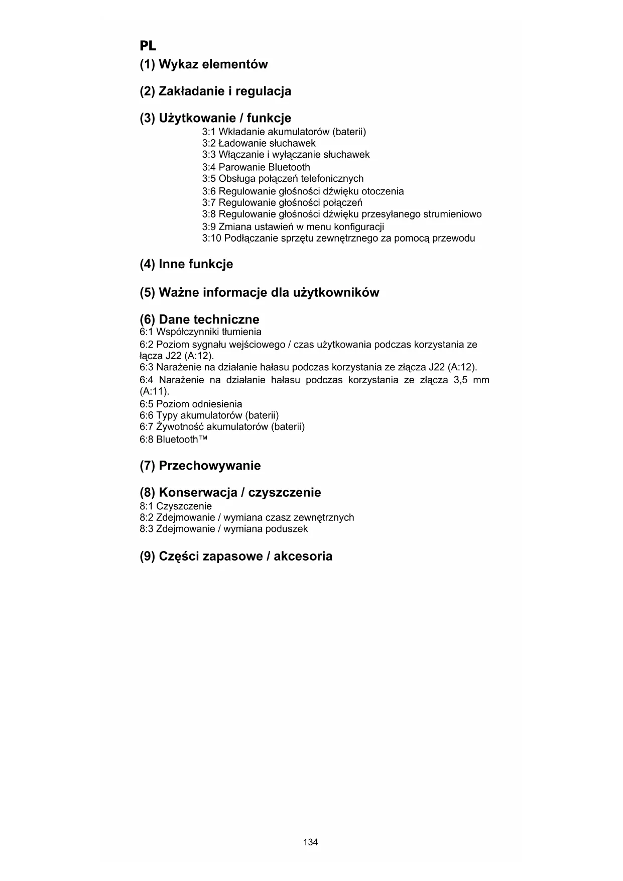 (1) Wykaz elementów (2) Zakładanie i regulacja (3) Użytkowanie / funkcje 3:1 Wkładanie akumulatorów (baterii) 3:2 Ładowanie słuchawek 3:3 Włączanie i wyłączanie słuchawek 3:4 Parowanie Bluetooth 3:5 Obsługa połączeń telefonicznych 3:6 Regulowanie głośności dźwięku otoczenia 3:7 Regulowanie głośności połączeń 3:8 Regulowanie głośności dźwięku przesyłanego strumieniowo 3:9 Zmiana ustawień w menu konguracji 3:10 Podłączanie sprzętu zewnętrznego za pomocą przewodu (4) Inne funkcje (5) Ważne informacje dla użytkowników (6) Dane techniczne 6:1 Współczynniki tłumienia 6:2 Poziom sygnału wejściowego / czas użytkowania podczas korzystania ze łącza J22 (A:12). 6:3 Narażenie na działanie hałasu podczas korzystania ze złącza J22 (A:12). 6:4 Narażenie na działanie hałasu podczas korzystania ze złącza 3,5 mm (A:11). 6:5 Poziom odniesienia 6:6 Typy akumulatorów (baterii) 6:7 Żywotność akumulatorów (baterii) 6:8 Bluetooth™ (7) Przechowywanie (8) Konserwacja / czyszczenie 8:1 Czyszczenie 8:2 Zdejmowanie / wymiana czasz zewnętrznych 8:3 Zdejmowanie / wymiana poduszek (9) Części zapasowe / akcesoria134