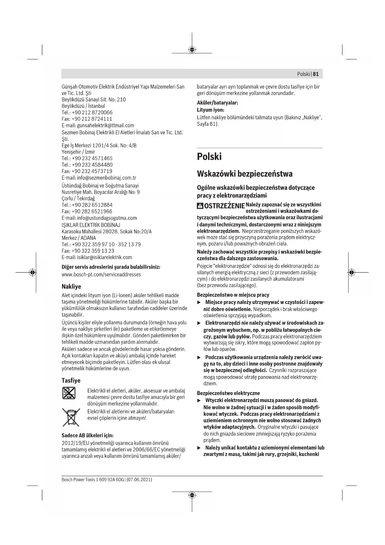 Karasoku Mahallesi 28028. Sokak No:20/A Merkez / ADANA Tel.: +903223599710 -3521379 Fax: +903223591323 E-mail: isiklar@isiklarelektrik.com Diğer servis adreslerini şurada bulabilirsiniz: www.bosch-pt.com/serviceaddresses Nakliye Alet içindeki lityum iyon (Li-Ionen) aküler tehlikeli madde taşıma yönetmeliği hükümlerine tabidir. Aküler başka bir yükümlülük olmaksızın kullanıcı tarafından caddeler üzerinde taşınabilir. Üçüncü kişiler eliyle yollanma durumunda (örneğin hava yolu ile veya nakliye şirketleri ile) paketleme ve etiketlemeye ilişkin özel hükümlere uyulmalıdır. Gönderi paketlenirken bir tehlikeli madde uzmanından yardım alınmalıdır. Aküleri sadece ve ancak gövdelerinde hasar yoksa gönderin. Açık kontakları kapatın ve aküyü ambalaj içinde hareket etmeyecek biçimde paketleyin. Lütfen olası ek ulusal yönetmelik hükümlerine de uyun. Tasfiye Elektrikli el aletleri, aküler, aksesuar ve ambalaj malzemesi çevre dostu tasfiye amacıyla bir geri dönüşüm merkezine yollanmalıdır. Elektrikli el aletlerini ve aküleri/bataryaları evsel çöplerin içine atmayın! Sadece AB ülkeleri için: 2012/19/EU yönetmeliği uyarınca kullanım ömrünü tamamlamış elektrikli el aletleri ve 2006/66/EC yönetmeliği uyarınca arızalı veya kullanım ömrünü tamamlamış aküler/ bataryalar ayrı ayrı toplanmak ve çevre dostu tasfiye için bir geri dönüşüm merkezine yollanmak zorundadır. Aküler/bataryalar: Lityum iyon: Lütfen nakliye bölümündeki talimata uyun (Bakınız „Nakliye“, Sayfa81). Polski Wskazówki bezpieczeństwa Ogólne wskazówki bezpieczeństwa dotyczące pracy z elektronarzędziami OSTRZEŻENIE Należy zapoznać się ze wszystkimi ostrzeżeniami i wskazówkami do- tyczącymi bezpieczeństwa użytkowania oraz ilustracjami i danymi technicznymi, dostarczonymi wraz z niniejszym elektronarzędziem. Nieprzestrzeganie poniższych wskazó- wek może stać się przyczyną porażenia prądem elektrycz- nym, pożaru i/lub poważnych obrażeń ciała. Należy zachować wszystkie przepisy i wskazówki bezpie- czeństwa dla dalszego zastosowania. Pojęcie "elektronarzędzie" odnosi się do elektronarzędzi za- silanych energią elektryczną z sieci (z przewodem zasilają- cym) i do elektronarzędzi zasilanych akumulatorami (bezprzewodu zasilającego). Bezpieczeństwo w miejscu pracy u Miejsce pracy należy utrzymywać w czystości i zapew- nić dobre oświetlenie. Nieporządek i brak właściwego oświetlenia sprzyjają wypadkom. u Elektronarzędzi nie należy używać w środowiskach za- grożonym wybuchem, np. w pobliżu łatwopalnych cie- czy, gazów lub pyłów. Podczas pracy elektronarzędziem wytwarzają się iskry, które mogą spowodować zapłon py- łów lub oparów. u Podczas użytkowania urządzenia należy zwrócić uwa- gę na to, aby dzieci i inne osoby postronne znajdowały się w bezpiecznej odległości. Czynniki rozpraszające mogą spowodować utratę panowania nad elektronarzę- dziem. Bezpieczeństwo elektryczne u Wtyczki elektronarzędzi muszą pasować do gniazd. Nie wolno w żadnej sytuacji i w żaden sposób modyfi- kować wtyczek. Podczas pracy elektronarzędziami z uziemieniem ochronnym nie wolno stosować żadnych wtyków adaptacyjnych. Oryginalne wtyczki i pasujące do nich gniazda sieciowe zmniejszają ryzyko porażenia prądem. u Należy unikać kontaktu z uziemionymi elementami lub zwartymi z masą, takimi jak rury, grzejniki, kuchenki Bosch Power Tools 1 609 92A 6DG | (07.06.2021)82 | Polski ilodówki. Uziemienie ciała zwiększa ryzyko porażenia prądem elektrycznym. u Elektronarzędzi nie wolno narażać na kontakt z desz- czem ani wilgocią. Przedostanie się wody do wnętrza obudowy zwiększa ryzyko porażenia prądem elektrycz- nym. u Nie używać przewodu zasilającego do innych celów. Nie wolno używać przewodu do przenoszenia ani prze- suwania elektronarzędzia; nie wolno też wyjmować wtyczki z gniazda, pociągając za przewód. Przewód należy chronić przed wysokimi temperaturami, należy go trzymać zdala od oleju, ostrych krawędzi i rucho- mych części urządzenia. Uszkodzone lub splątane prze- wody zwiększają ryzyko porażenia prądem elektrycznym. u Używając elektronarzędzia na świeżym powietrzu, na- leży upewnić się, że przedłużacz jest przeznaczony do pracy na zewnątrz. Użycie przedłużacza przeznaczone- go do pracy na zewnątrz zmniejsza ryzyko porażenia prą- dem elektrycznym. u Jeżeli nie ma innej możliwości, niż użycie elektrona- rzędzia w wilgotnym otoczeniu, należy podłączyć je do źródła zasilania wyposażonego w wyłącznik ochronny różnicowoprądowy. Zastosowanie wyłącznika ochron- nego różnicowoprądowego zmniejsza ryzyko porażenia prądem elektrycznym. Bezpieczeństwo osób u Podczas pracy z elektronarzędziem należy zachować czujność, każdą czynność wykonywać ostrożnie i z rozwagą. Nie przystępować do pracy elektronarzę- dziem w stanie zmęczenia lub będąc pod wpływem narkotyków, alkoholu lub leków. Chwila nieuwagi pod- czas pracy może grozić bardzo poważnymi obrażeniami ciała. u Stosować środki ochrony osobistej. Należy zawsze nosić okulary ochronne. Środki ochrony osobistej, np. maska przeciwpyłowa, antypoślizgowe obuwie, kask ochronny czy ochraniacze na uszy, w określonych warun- kach pracy obniżają ryzyko obrażeń ciała. u Należy unikać niezamierzonego uruchomienia narzę- dzia. Przed podłączeniem elektronarzędzia do źródła zasilania i/lub podłączeniem akumulatora, podniesie- niem albo transportem urządzenia, należy upewnić się, że włącznik elektronarzędzia znajduje się w pozy- cji wyłączonej. Przenoszenie elektronarzędzia z palcem opartym na włączniku/wyłączniku lub włożenie do gniaz- da sieciowego wtyczki włączonego narzędzia, może stać się przyczyną wypadków. u Przed włączeniem elektronarzędzia należy usunąć wszystkie narzędzia