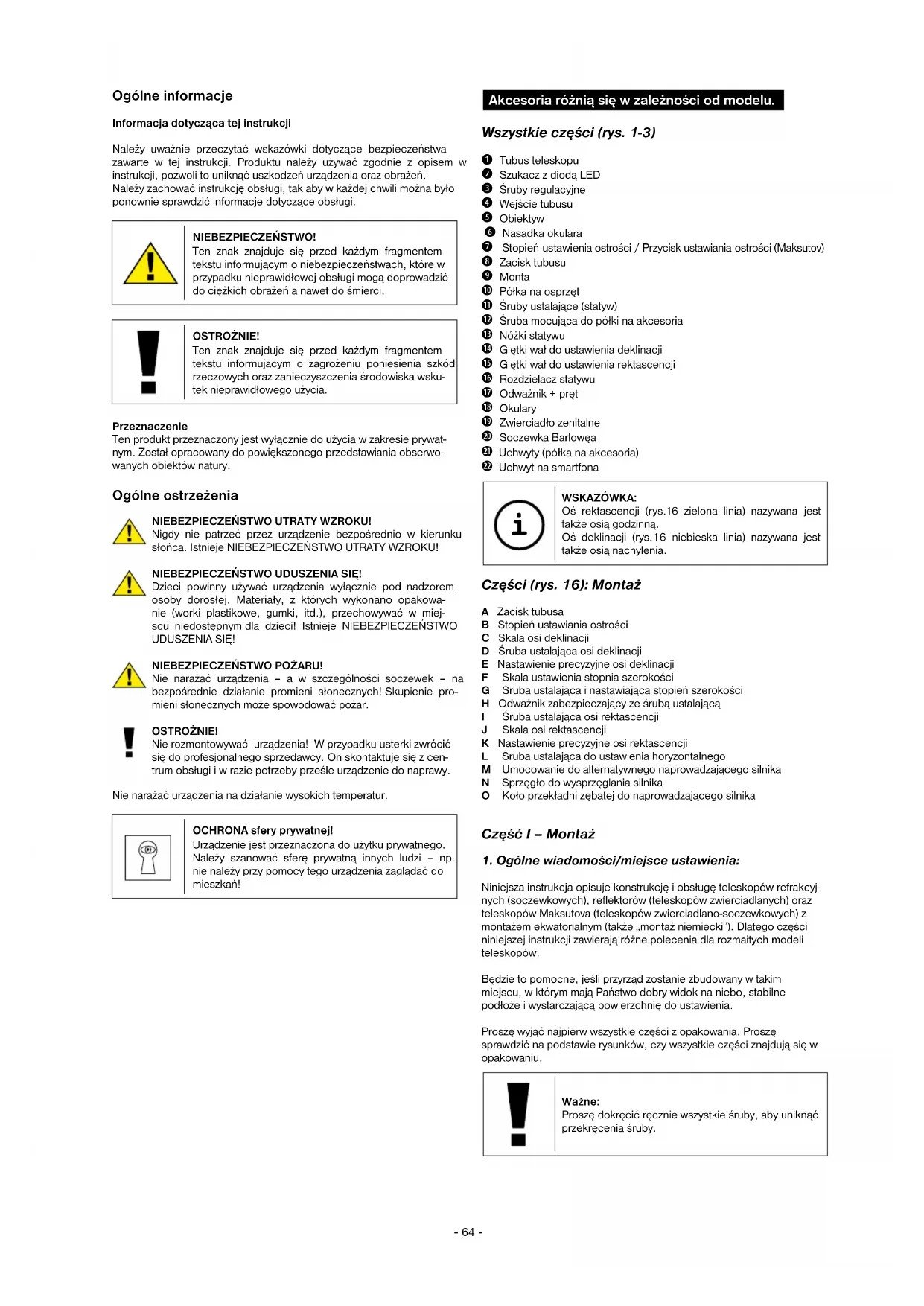 Niniejsza instrukcja opisuje konstrukcję i obsługę teleskopów refrakcyj- nych (soczewkowych), reflektorów (teleskopów zwierciadlanych) oraz teleskopów Maksutova (teleskopów zwierciadlano-soczewkowych) z montażem ekwatorialnym (także „montaż niemiecki”). Dlatego części niniejszej instrukcji zawierają różne polecenia dla rozmaitych modeli teleskopów. Będzie to pomocne, jeśli przyrząd zostanie zbudowany w takim miejscu, w którym mają Państwo dobry widok na niebo, stabilne podłoże i wystarczającą powierzchnię do ustawienia. Proszę wyjąć najpierw wszystkie części z opakowania. Proszę sprawdzić na podstawie rysunków, czy wszystkie części znajdują się w opakowaniu. Ważne: Proszę dokręcić ręcznie wszystkie śruby, aby uniknąć przekręcenia śruby.- 65 -