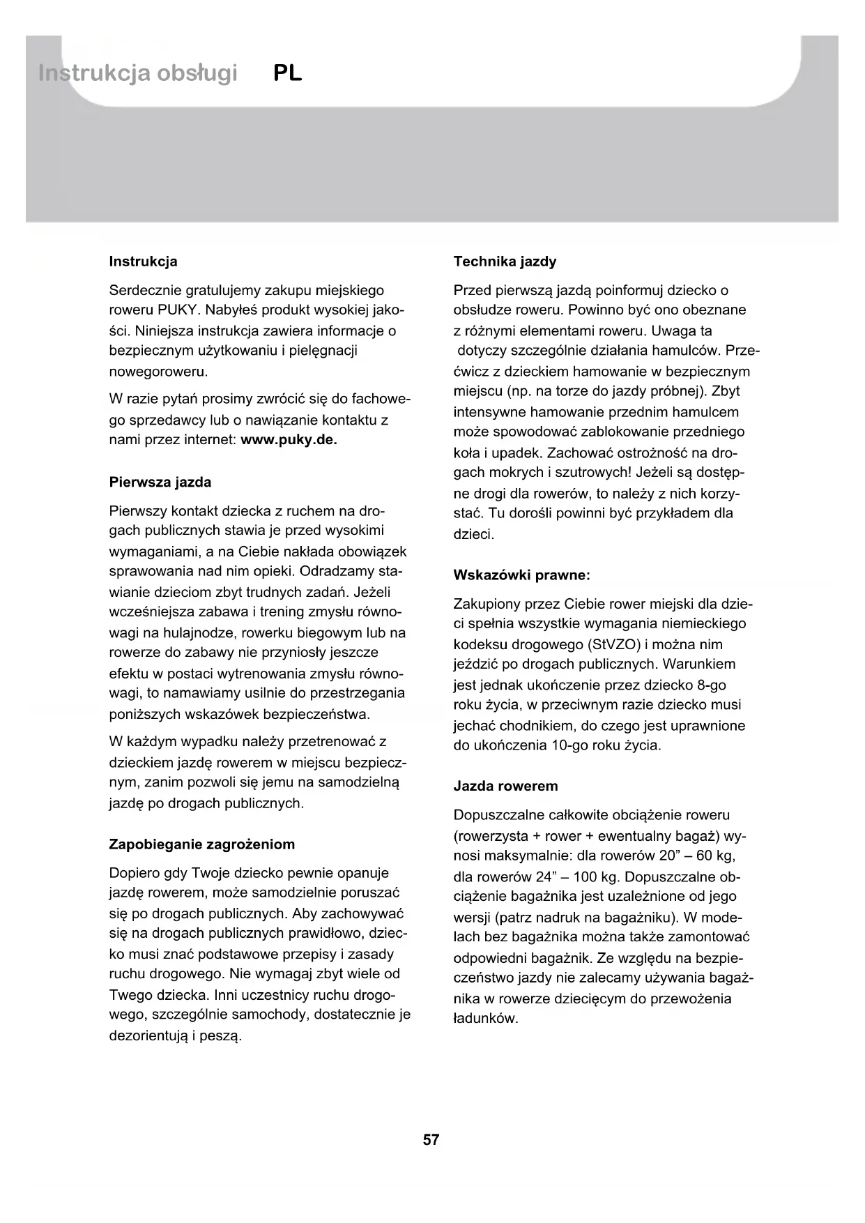 Serdecznie gratulujemy zakupu miejskiego roweru PUKY. Nabyles Produkt wysokiej jakosci. Niniejsza instrukcja zawiera informacja o bezpiecznym uzytkowaniu i pielegnacje nowegroweru.