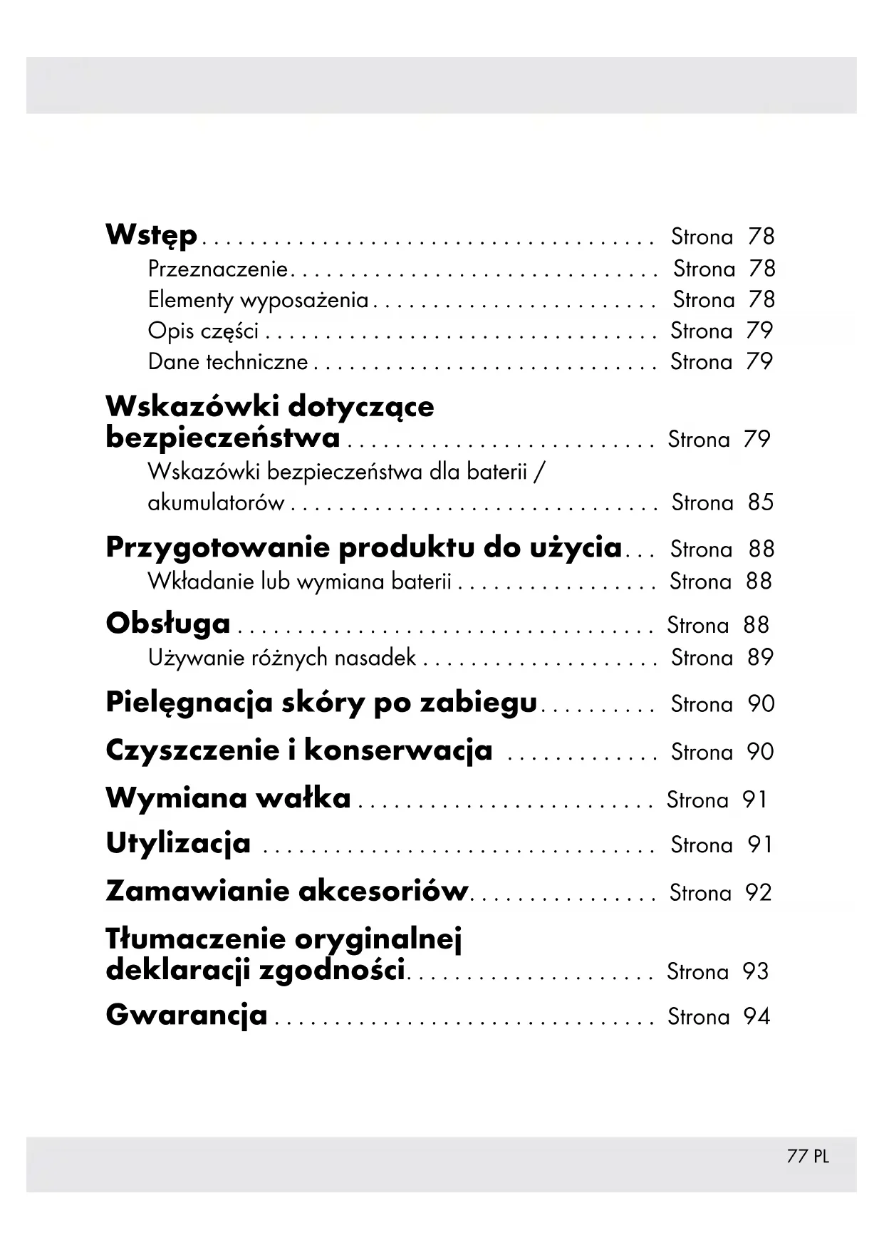 OSTRZEŻENIE! Długotrwałe użytkowanie spowoduje, że produkt silnie się nagrzeje, co może powodować oparzenia. Dlatego należy regularnie to sprawdzać podczas używania. Szczególnie diabetycy są mniej wrażliwi na oparzenia. Zachowywać wyjątkową ostrożność. W razie potrzeby skonsultować się z lekarzem. m UWAGA! Produkt nie jest zabawką. Dzieci często nie doceniają zagrożeń związanych z urządzeniami elektrycznymi. Produkt może być używany pod nadzorem przez dzieci w wieku powyżej 3 lat. Produkt ten może być używany przez dzieci w wieku powyżej 8lat i osoby o ograniczonych zdolnościach fizycznych, sensorycznych lub umysłowych albo braku doświadczenia i wiedzy o ile są nadzorowane lub pouczone o bezpiecznym użyciu produktu i wynikających z niego zagrożeniach.81 PL Nie pozwalać dzieciom na bawienie się produktem. Czyszczenie i konserwacja przez użytkownika nie mogą być przeprowadzane przez dzieci pozostawione bez nadzoru. Nie używać urządzenia, jeśli jest uszkodzone. W przeciwnym razie mogą wystąpić obrażenia. Upewniać się, że wewnątrz produktu nie ma obcych przedmiotów. Produkt otwierać tylko w celu wymiany baterii. Produkt nie zawiera żadnych części, które mogą być serwisowane przez użytkownika. Wyłączać przed czyszczeniem i konserwacją. Nie narażać produktu na działanie wysokich temperatur, aby uniknąć uszkodzeń. Nie stosować silnych uderzeń lub nacisku mechanicznego na produkt, aby uniknąć uszkodzenia.82 PL W sprawach napraw, uszkodzeń lub innych problemów z produktem konsultować się ze specjalistą. Nie zanurzać produktu w wodzie. Nie używać produktu w wannach, pod prysznicem, w basenach lub zbiornikach wypełnionych wodą. Nie używać produktu, jeśli masz rany lub podrażnioną skórę na dłoniach lub stopach. m UWAGA! Delikatnie przesuwać produkt ruchem okrężnym i nie zatrzymywać w jednym miejscu. W przeciwnym razie mogą pojawić się bolesne podrażnienia. m UWAGA! Nie należy wywierać nadmiernego nacisku i zawsze delikatnie przesuwać nasadkę pod miejscu poddawanym zabiegowi.83 PL Upewniać się, że wałek może zawsze swobodnie się obracać. Nie wolno go trwale blokować, bo w przeciwnym razie może powstać silne ciepło, które uszkodzi produkt. m UWAGA! Podczas używania regularnie sprawdzać efekt zabiegu. W przypadku zauważenia jakiekolwiek dokuczliwych reakcji skórnych zabieg należy natychmiast przerwać. Ze względów higienicznych produkt powinien być używany tylko przez jedną osobę. Nie upuszczać produktu, aby uniknąć uszkodzenia wewnętrznych części. Nie pozwalać, aby woda lub inne płyny dostały się do wnętrza produktu. W takim przypadku należy wyjąć baterie i nie używać produktu, dopóki nie będzie całkowicie suchy.84 PL Przed każdym użyciem sprawdzić produkt. Nie używać produktu, jeśli wałek jest uszkodzony lub działa nieprawidłowo, w przeciwnym razie może dojść do obrażeń. Aby uniknąć obrażeń, korzystać wyłącznie z wałka dostarczonego z produktem lub zamówionego online. Informacje o zamawianiu: Patrz rozdział „Zamawianie akcesoriów”. Urządzenie należy używać mając suche ręce. OSTRZEŻENIE! Chronić urządzenie przed wilgocią. Nie zanurzać urządzenia w wodzie. OSTRZEŻENIE! Produkt powinien być suchy.85 PL Wskazówki bezpieczeństwa dla baterii/ akumulatorów m ZAGROŻENIE ŻYCIA! Baterie/ akumulatory należy trzymać poza zasięgiem dzieci. W przypadku połknięcia należy natychmiast udać się do lekarza! NIEBEZPIECZEŃSTWO WYBUCHU! Baterii jednorazowego użytku nie wolno ładować ponownie. Baterii/ akumulatorów nie należy zwierać i/ lub otwierać. Może to doprowadzić do przegrzania, pożaru lub wybuchu. Nigdy nie należy wrzucać baterii/ akumulatorów do ognia lub wody. Nigdy nie należy narażać baterii/ akumulatorów na obciążenia mechaniczne.86 PL Ryzyko wycieku kwasu z baterii/ akumulatorów Należy unikać ekstremalnych warunków i temperatur, które mogą oddziaływać na baterie/ akumulatory, np. kaloryferów/ bezpośredniego działania promieniowania słonecznego. Jeśli wyciekną baterie/ akumulatory, należy unikać kontaktu skóry, oczu i błon śluzowych z chemikaliami! Dotknięte miejsca natychmiast przepłukać czystą wodą i udać się do lekarza!
