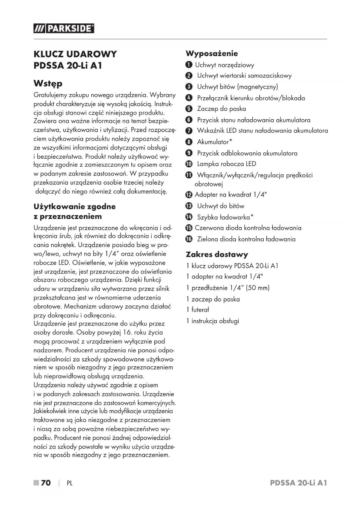 PL KLUCZ UDAROWY PDSSA20-Li A1 Wstęp Gratulujemy zakupu nowego urządzenia. Wybrany produkt charakteryzuje się wysoką jakością. Instruk- cja obsługi stanowi część niniejszego produktu. Zawiera ona ważne informacje na temat bezpie- czeństwa, użytkowania iutylizacji. Przed rozpoczę- ciem użytkowania produktu należy zapoznać się ze wszystkimi informacjami dotyczącymi obsługi ibezpieczeństwa. Produkt należy użytkować wy- łącznie zgodnie zzamieszczonym tu opisem oraz wpodanym zakresie zastosowań. Wprzypadku przekazania urządzenia osobie trzeciej należy dołączyć do niego również całą dokumentację. Użytkowanie zgodne z przeznaczeniem Urządzenie jest przeznaczone do wkręcania iod- kręcania śrub, jak również do dokręcania i odkrę- cania nakrętek. Urządzenie posiada bieg w pra- wo/lewo, uchwyt na bity 1/4” oraz oświetlenie robocze LED. Oświetlenie, wjakie wyposażone jest urządzenie, jest przeznaczone do oświetlania obszaru roboczego urządzenia. Dzięki funkcji udaru w urządzeniu siła wytwarzana przez silnik przekształcana jest w równomierne uderzenia obrotowe. Mechanizm udarowy zaczyna działać przy dokręcaniu i odkręcaniu. Urządzenie jest przeznaczone do użytku przez osoby dorosłe. Osoby powyżej 16. roku życia mogą pracować z urządzeniem wyłącznie pod nadzorem. Producent urządzenia nie ponosi odpo- wiedzialności za szkody spowodowane użytkowa- niem w sposób niezgodny z jego przeznaczeniem lub nieprawidłową obsługą urządzenia. Urządzenia należy używać zgodnie zopisem iwpodanych zakresach zastosowania. Urządzenie nie jest przeznaczone do zastosowań komercyjnych. Jakiekolwiek inne użycie lub modyfikacje urządzenia traktowane są jako niezgodne zprzeznaczeniem iniosą za sobą poważne niebezpieczeństwo wy- padku. Producent nie ponosi żadnej odpowiedzial- ności za szkody powstałe wwyniku użycia urządze- nia wsposób niezgodny zjego przeznaczeniem. Wyposażenie Uchwyt narzędziowy Uchwyt wiertarski samozaciskowy Uchwyt bitów (magnetyczny) Przełącznik kierunku obrotów/blokada Zaczep do paska Przycisk stanu naładowania akumulatora Wskaźnik LED stanu naładowania akumulatora Akumulator* Przycisk odblokowania akumulatora Lampka robocza LED Włącznik/wyłącznik/regulacja prędkości obrotowej Adapter na kwadrat 1/4" Uchwyt do bitów Szybka ładowarka* Czerwona dioda kontrolna ładowania Zielona dioda kontrolna ładowania Zakres dostawy 1 klucz udarowy PDSSA 20-Li A1 1 adapter na kwadrat 1/4" 1 przedłużenie 1/4“ (50 mm) 1 zaczep do paska 1 futerał 1 instrukcja obsługiPDSSA 20-Li A1 PL