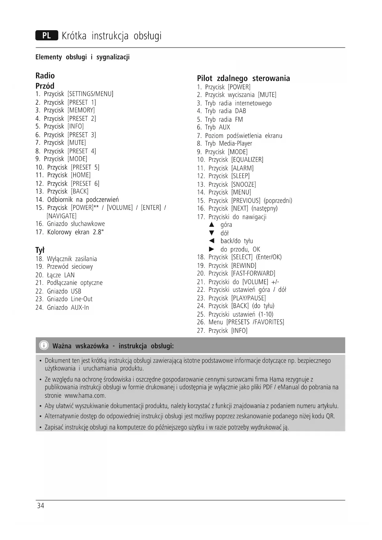 - Ze względu na ochronę środowiska i oszczędne gospodarowanie cennymi surowcami rma Hama rezygnuje z publikowania instrukcji obsługi w formie drukowanej i udostępnia je wyłącznie jako pliki PDF / eManual do pobrania na stronie www.hama.com.