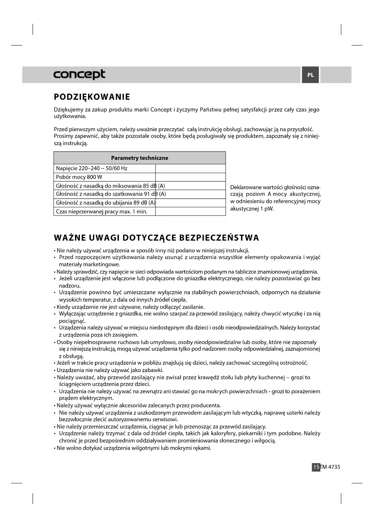 Dziękujemy za zakup produktu marki Concept i życzymy Państwu pełnej satysfakcji przez cały czas jego użytkowania. Przed pierwszym użyciem, należy uważnie przeczytać całą instrukcję obsługi, zachowując ją na przyszłość. Prosimy zapewnić, aby także pozostałe osoby, które będą posługiwały się produktem, zapoznały się z niniej- szą instrukcją. Parametry techniczne Napięcie 220–240 ~ 50/60 Hz Pobór mocy 800 W Głośność z nasadką do miksowania 85 dB (A) Głośność z nasadką do szatkowania 91 dB (A) Głośność z nasadką do ubijania 89 dB (A) Czas nieprzerwanej pracy max. 1 min. WAŻNE UWAGI DOTYCZĄCE BEZPIECZEŃSTWA