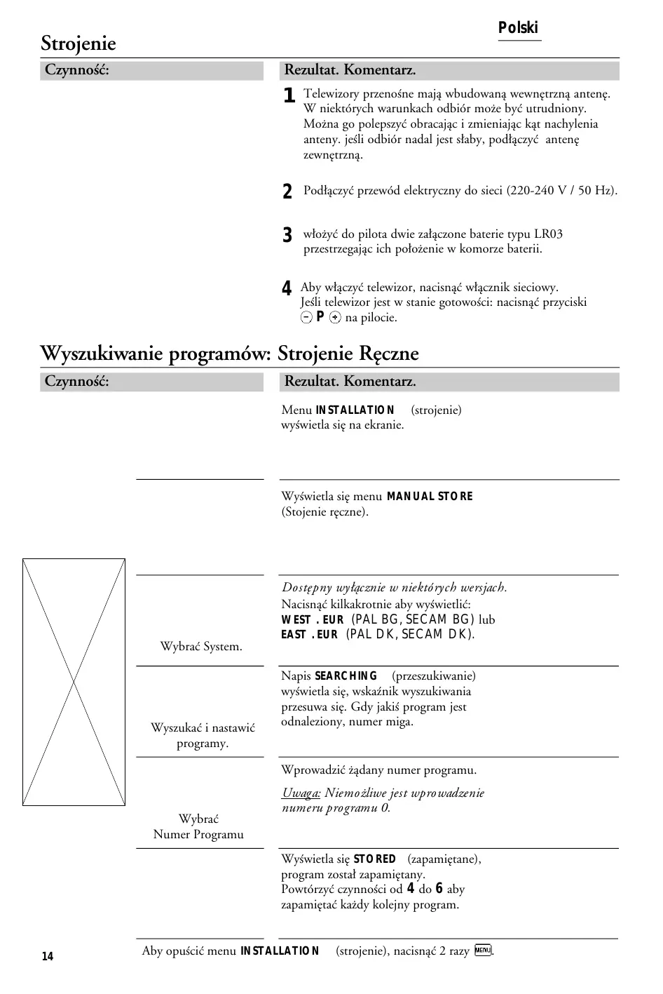 Aby w∏àczyç telewizor, nacisnàç w∏àcznik sieciowy. JeÊli telewizor jest w stanie gotowoÊci: nacisnàç przyciski P na pilocie. Wyszukiwanie programów: Strojenie R´czne CzynnoÊç: Rezultat. Komentarz. Menu INSTALLATION (strojenie) wyÊwietla si´ na ekranie. WyÊwietla si´ menu MANUAL STORE (Stojenie r´czne). Wybraç System. Wyszukaç i nastawiç programy. Dost´pny wy∏àcznie w niektórych wersjach. Nacisnàç kilkakrotnie aby wyÊwietliç: WEST . EUR (PAL BG, SECAM BG) lub EAST . EUR (PAL DK, SECAM DK). Napis SEARCHING (przeszukiwanie) wyÊwietla si´, wskaênik wyszukiwania przesuwa si´. Gdy jakiÊ program jest odnaleziony, numer miga. Wprowadziç ˝àdany numer programu. Wybraç Numer Programu Uwaga: Niemo˝liwe jest wprowadzenie numeru programu 0. WyÊwietla si´ STORED (zapami´tane), program zosta∏ zapami´tany. Powtórzyç czynnoÊci od 4 do 6 aby zapami´taç ka˝dy kolejny program.