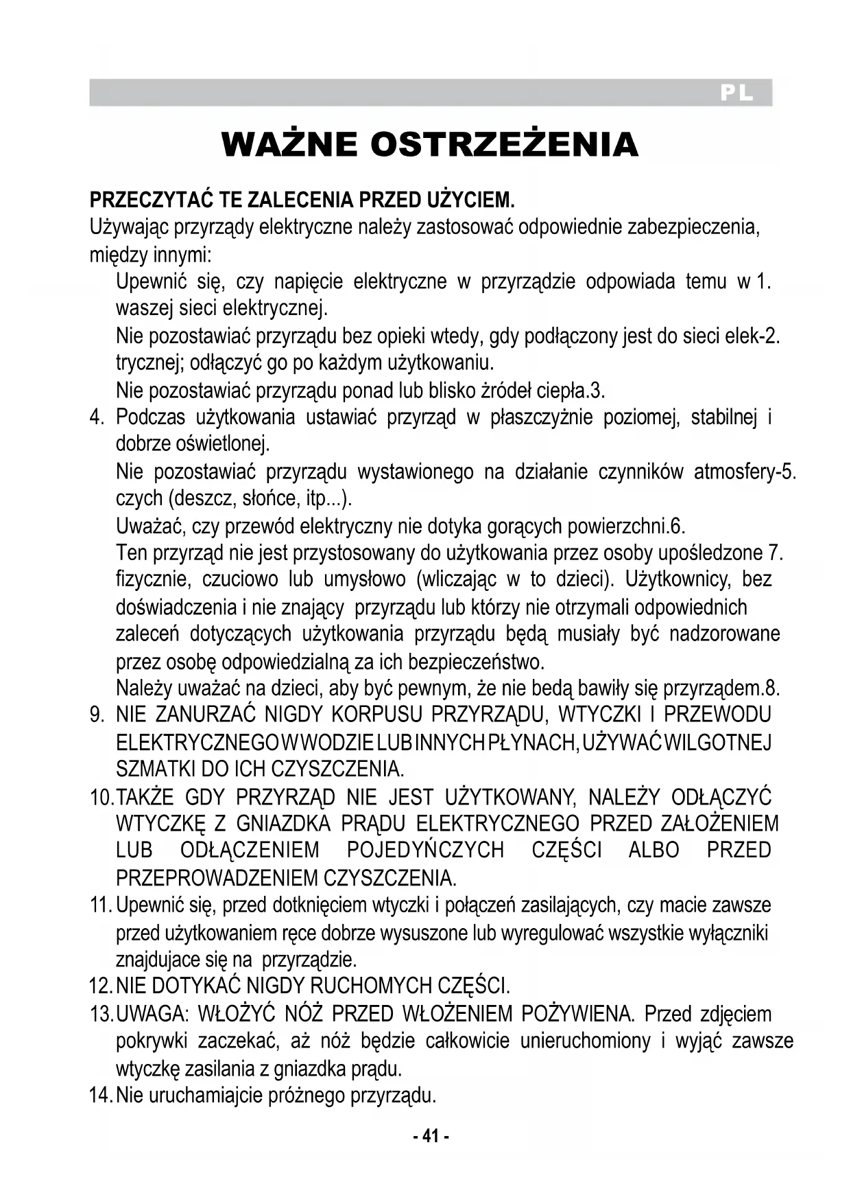 PRZECZYTAĆ TE ZALECENIA PRZED UŻYCIEM. Używając przyrządy elektryczne należy zastosować odpowiednie zabezpieczenia, między innymi: Upewnić się, czy napięcie elektryczne w przyrządzie odpowiada temu w 1. waszej sieci elektrycznej. Nie pozostawiać przyrządu bez opieki wtedy, gdy podłączony jest do sieci elek-2. trycznej; odłączyć go po każdym użytkowaniu. Nie pozostawiać przyrządu ponad lub blisko żródeł ciepła.3. Podczas użytkowania ustawiać przyrząd w płaszczyżnie poziomej, stabilnej i 4. dobrze oświetlonej. Nie pozostawiać przyrządu wystawionego na działanie czynników atmosfery-5. czych (deszcz, słońce, itp...). Uważać, czy przewód elektryczny nie dotyka gorących powierzchni.6. Ten przyrząd nie jest przystosowany do użytkowania przez osoby upośledzone 7. fizycznie, czuciowo lub umysłowo (wliczając w to dzieci). Użytkownicy, bez doświadczenia i nie znający przyrządu lub którzy nie otrzymali odpowiednich zaleceń dotyczących użytkowania przyrządu będą musiały być nadzorowane przez osobę odpowiedzialną za ich bezpieczeństwo. Należy uważać na dzieci, aby być pewnym, że nie bedą bawiły się przyrządem.8. NIE ZANURZAĆ NIGDY KORPUSU PRZYRZĄDU, WTYCZKI I PRZEWODU 9. ELEKTRYCZNEGO W WODZIE LUB INNYCH PŁYNACH, UŻYWAĆ WILGOTNEJ SZMATKI DO ICH CZYSZCZENIA. TAKŻE GDY PRZYRZĄD NIE JEST UŻYTKOWANY, NALEŻY ODŁĄCZYĆ 10. WTYCZKĘ Z GNIAZDKA PRĄDU ELEKTRYCZNEGO PRZED ZAŁOŻENIEM LUB ODŁĄCZENIEM POJEDYŃCZYCH CZĘŚCI ALBO PRZED PRZEPROWADZENIEM CZYSZCZENIA. Upewnić się, przed dotknięciem wtyczki i połączeń zasilających, czy macie zawsze 11. przed użytkowaniem ręce dobrze wysuszone lub wyregulować wszystkie wyłączniki znajdujace się na przyrządzie. NIE DOTYKAĆ NIGDY RUCHOMYCH CZĘŚCI.12. UWAGA: WŁOŻYĆ NÓŻ PRZED WŁOŻENIEM POŻYWIENA. Przed zdjęciem 13. pokrywki zaczekać, aż nóż będzie całkowicie unieruchomiony i wyjąć zawsze wtyczkę zasilania z gniazdka prądu. Nie uruchamiajcie próżnego przyrządu.14.PL