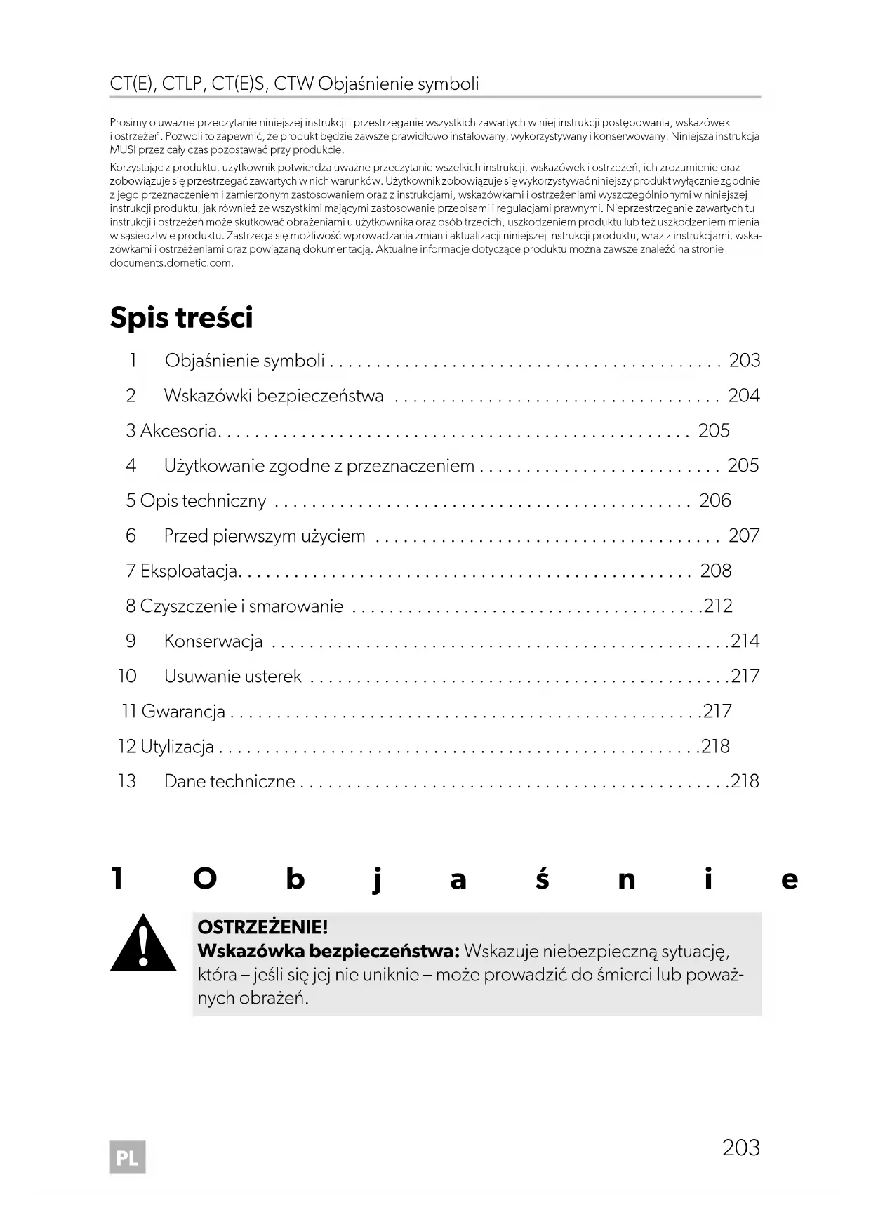 - Prosimy o uważne przeczytanie niniejszej instrukcji i przestrzeganie wszystkich zawartych w niej instrukcji postępowania, wskazówek i ostrzeżeń. Pozwoli to zapewnić, że produkt będzie zawsze prawidłowo instalowany, wykorzystywany i konserwowany. Niniejsza instrukcja MUSI przez cały czas pozostawać przy produkcie. Korzystając z produktu, użytkownik potwierdza uważne przeczytanie wszelkich instrukcji, wskazówek i ostrzeżeń, ich zrozumienie oraz zobowiązuje się przestrzegać zawartych w nich warunków. Użytkownik zobowiązuje się wykorzystywać niniejszy produkt wyłącznie zgodnie z jego przeznaczeniem i zamierzonym zastosowaniem oraz z instrukcjami, wskazówkami i ostrzeżeniami wyszczególnionymi w niniejszej instrukcji produktu, jak również ze wszystkimi mającymi zastosowanie przepisami i regulacjami prawnymi. Nieprzestrzeganie zawartych tu instrukcji i ostrzeżeń może skutkować obrażeniami u użytkownika oraz osób trzecich, uszkodzeniem produktu lub też uszkodzeniem mienia w sąsiedztwie produktu. Zastrzega się możliwość wprowadzania zmian i aktualizacji niniejszej instrukcji produktu, wraz z instrukcjami, wska- zówkami i ostrzeżeniami oraz powiązaną dokumentacją. Aktualne informacje dotyczące produktu można zawsze znaleźć na stronie documents.dometic.com. Spis treści 1 Objaśnienie symboli p. 203