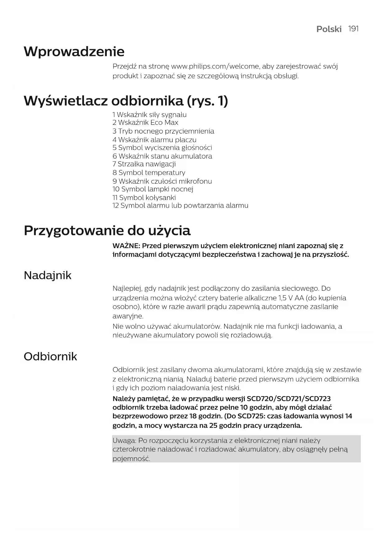 Naleź y pamiętac, ze w przypadku wersji SCD720/SCD721/SCD723 odiornik trzeba ladować przyez peñe 10 godzin, aby sądz降到 bezprzewodowo przyez 18 godzin. (Do SCD725: czas ladowaniaDynosi 14 godzin, a mocy wystarcza na 25 godzin przyca urzadzenia.