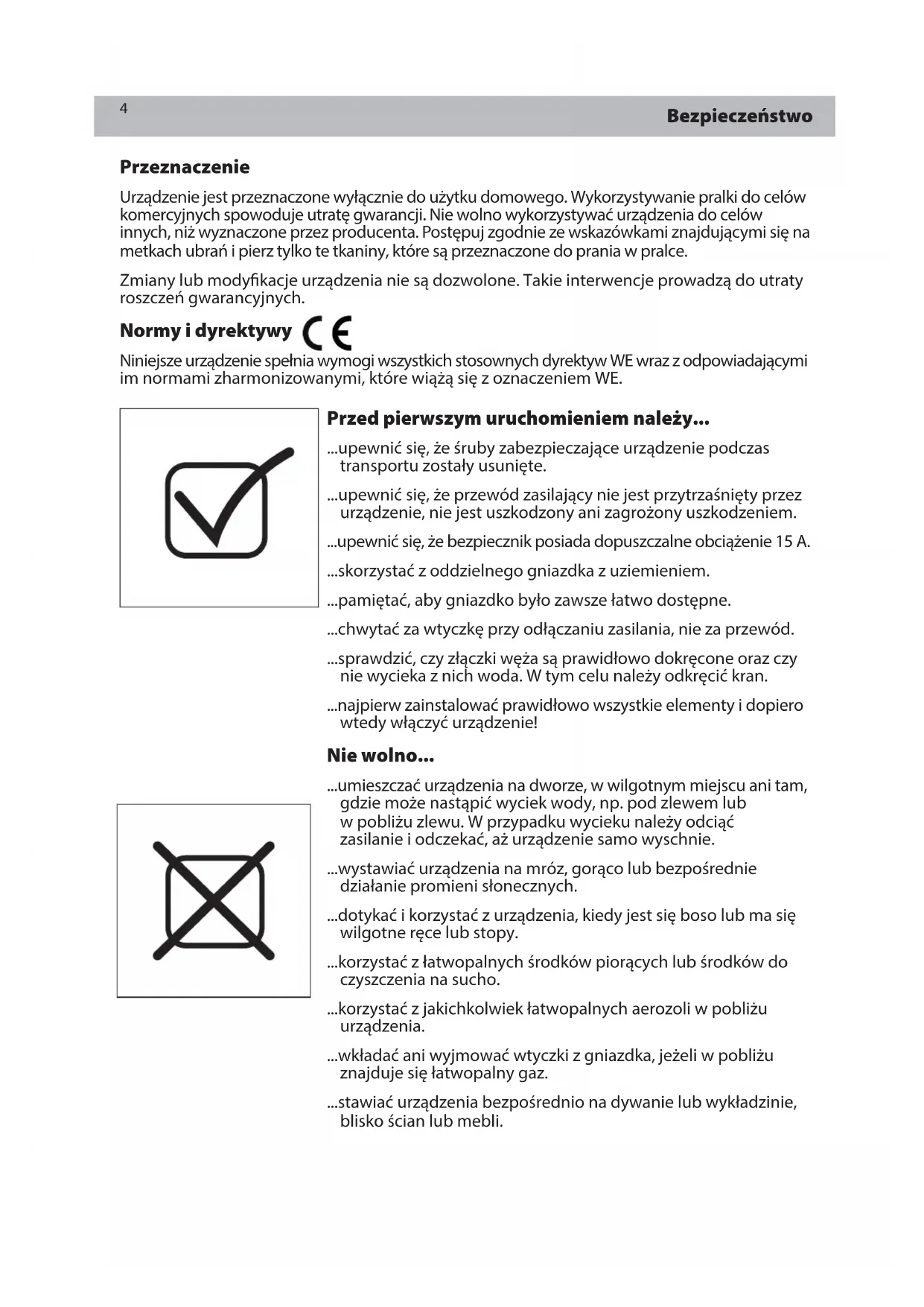 Przeznaczenie Urządzenie jest przeznaczone wyłącznie do użytku domowego. Wykorzystywanie pralki do celów komercyjnych spowoduje utratę gwarancji. Nie wolno wykorzystywać urządzenia do celów innych, niż wyznaczone przez producenta. Postępuj zgodnie ze wskazówkami znajdującymi się na metkach ubrań i pierz tylko te tkaniny, które są przeznaczone do prania w pralce. Zmiany lub modykacje urządzenia nie są dozwolone. Takie interwencje prowadzą do utraty roszczeń gwarancyjnych. Normy i dyrektywy Niniejsze urządzenie spełnia wymogi wszystkich stosownych dyrektyw WE wraz z odpowiadającymi im normami zharmonizowanymi, które wiążą się z oznaczeniem WE.5 Bezpieczeństwo W trakcie codziennego użytkowania urządzenia należy... ...pozapinać zamki błyskawiczne, usunąć luźne nitki i małe przedmioty, aby zapobiec splątaniu się pranych rzeczy. Jeśli to konieczne, użyć odpowiedniej torby lub siatki. ...odłączyć je od gniazdka ściennego po każdym praniu, aby oszczędzać prąd i zachować bezpieczeństwo. ...zachować dół części przeszklonej w czystości; jeśli urządzenie nie jest używane, należy otworzyć drzwiczk