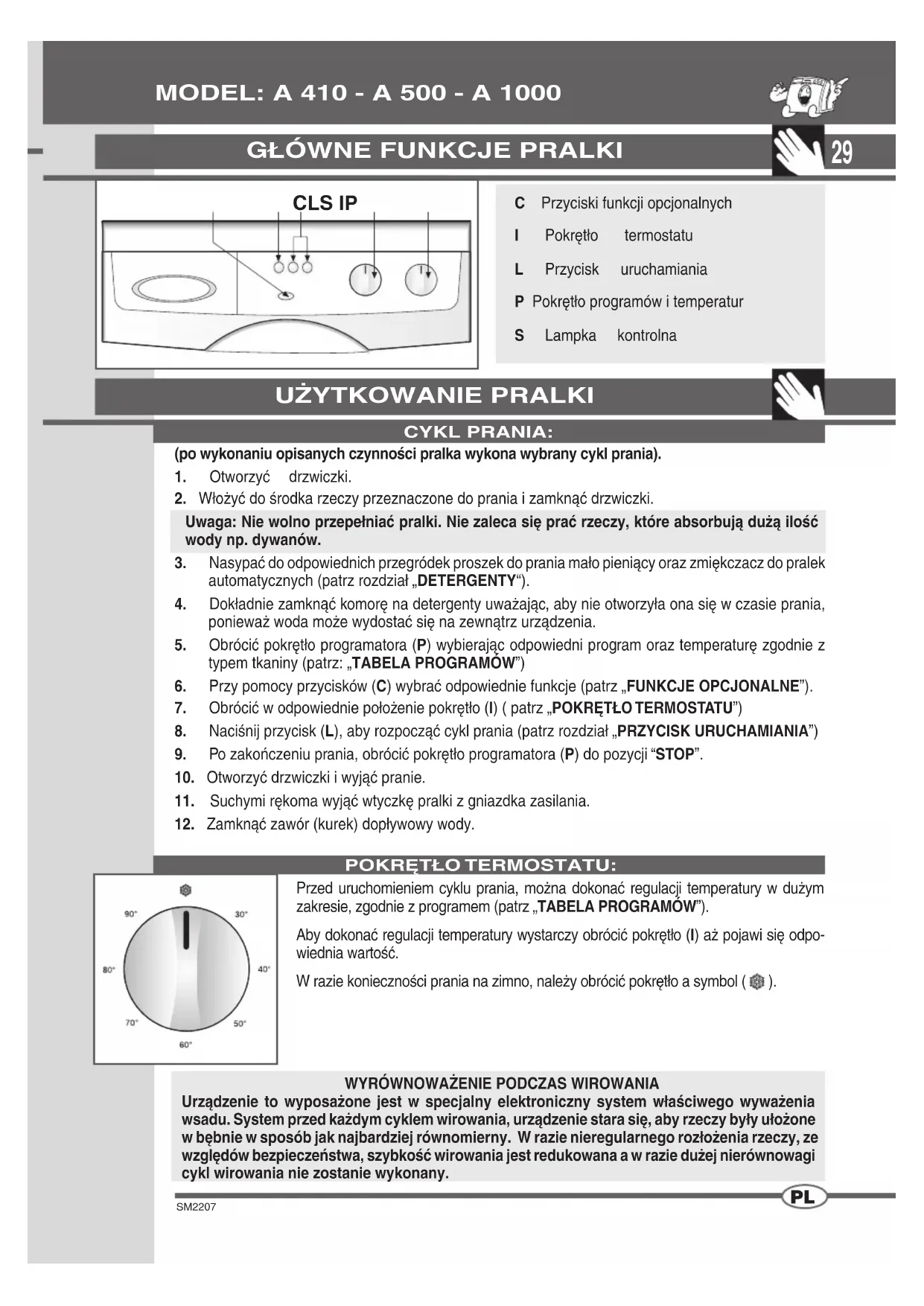 STOP SPIA DI CONTROLLO: Lampka jest zgaszona jeżeli pokrętło programatora znajduje się w pozycji STOP. Jest ona cały czas zapalona podczas trwania programu prania. Lampka miga wolno po zakończeniu prania.„STOP” NA PROGRAMATORZE: FUNKCJE OPCJONALNE Po naciśnięciu tego przycisku, otrzymuje się krótkie pranie wstępne w temperaturze maksymalnie 40°C przez czas około 10 minut. Funkcja ta może być używana tylko z programami „BAWEŁNA”, „SYNTETYCZNE” oraz „CODZIENNY”. Uwaga: W razie korzystania z tej funkcji, detergent należy także dodać do przegródki przeznaczonej do prania wstępnego.PRANIE WSTĘPNE:Funkcja stop służy do zatrzymania pralki. Jeżeli z jakiegoś powodu podczas cyklu prania zajdzie potrzeba zmiany programu lub dołożenia rzeczy do środka, wystarczy ustawić pokrętło programów w pozycji “STOP”, następnie można ustawić pokrętła w nowej pozycji i nacisnąć przycisk “START”.UWAGA!! Zaleca się korzystanie z tej funkcji tylko, jeżeli jest to konieczne, a program nie trwał dłużej niż 3 minuty. Przed otwarciem drzwiczek po zatrzymaniu, należy odczekać 2 minuty na ich odblokowanie.Po przyciśnięciu tego przycisku pralka uruchamia cykl prania.WYŁĄCZENIE WIROWANIA:Po wybraniu tej funkcji urządzenie wykona cykl prania bez wirowania.Uwaga: Dostępność funkcji opcjonalnych zależy od typu wybranego programu, jeżeli funkcja nie jest przewidziana dla danego programu nie będzie ona dostępna (patrz TABELA PROGRAMÓW). PRZYCISK URUCHAMIANIA:31 SM2207