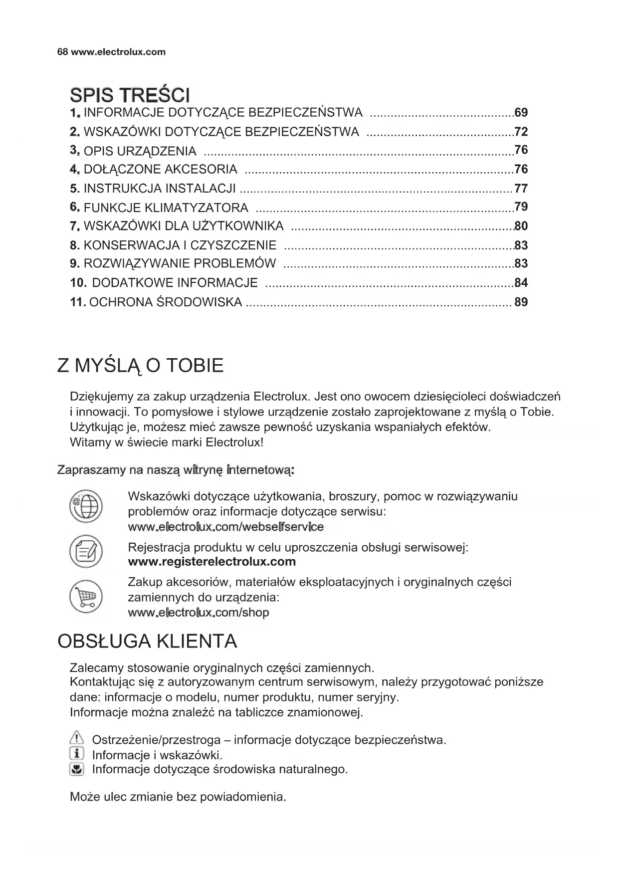 Dziękujemy za zakup urządzenia Electrolux. Jest ono owocem dziesięcioleci doświadczeń i innowacji. To pomysłowe i stylowe urządzenie zostało zaprojektowane z myślą o Tobie. Użytkując je, możesz mieć zawsze pewność uzyskania wspaniałych efektów. Witamy w świecie marki Electrolux! Zalecamy stosowanie oryginalnych części zamiennych. Kontaktując się z autoryzowanym centrum serwisowym, należy przygotować poniższe dane: informacje o modelu, numer produktu, numer seryjny. Informacje można znaleźć na tabliczce znamionowej. Może ulec zmianie bez powiadomienia. Ostrzeżenie/przestroga – informacje dotyczące bezpieczeństwa. Informacje i wskazówki. Informacje dotyczące środowiska naturalnego. Wskazówki dotyczące użytkowania, broszury, pomoc w rozwiązywaniu problemów oraz informacje dotyczące serwisu: www.electrolux.com/webselfservice Zapraszamy na naszą witrynę internetową: Rejestracja produktu w celu uproszczenia obsługi serwisowej: www.registerelectrolux.com Zakup akcesoriów, materiałów eksploatacyjnych i oryginalnych części zamiennych do urządzenia: www.electrolux.com/shop