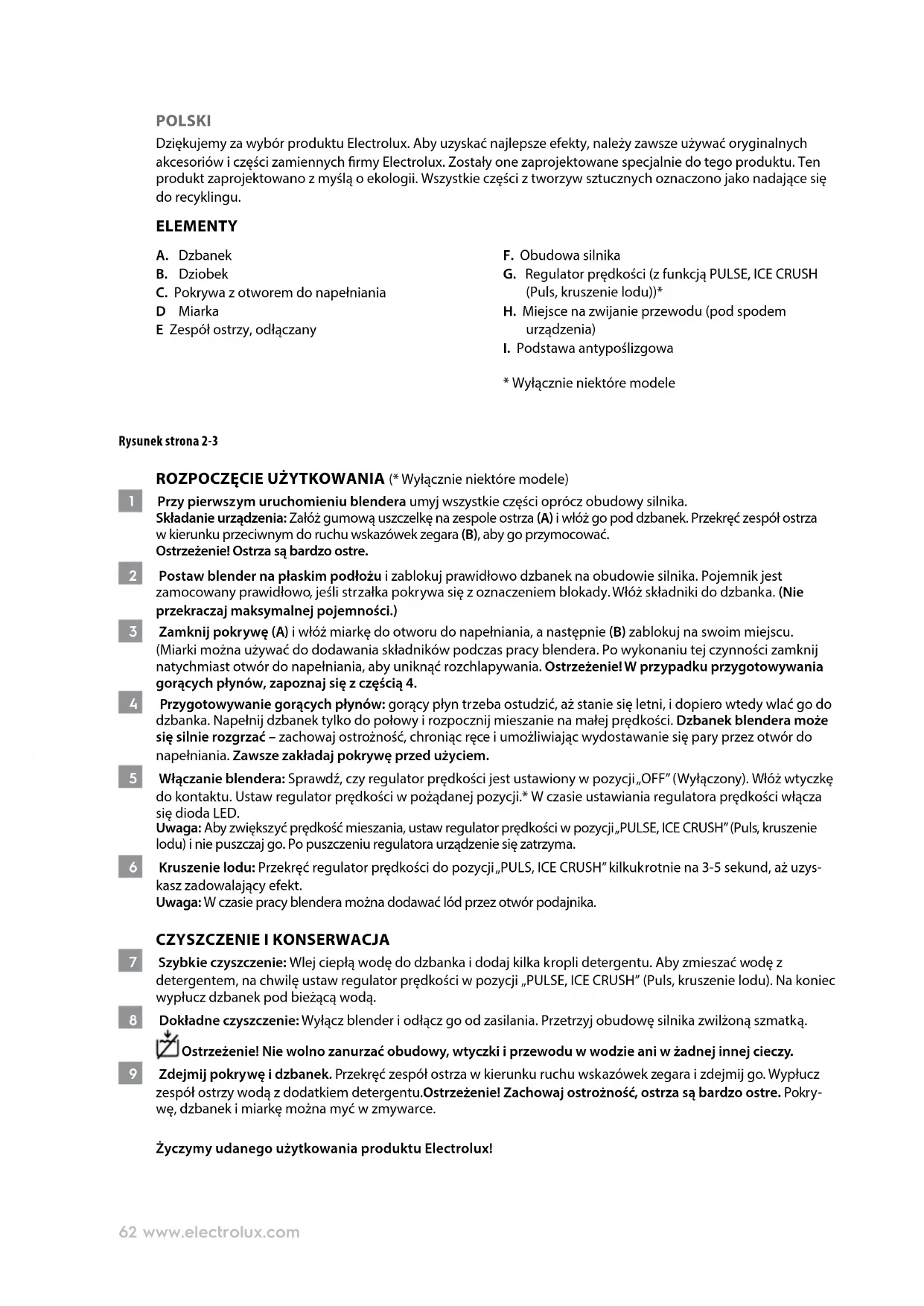 Objaw Przyczyna Rozwiązanie Blender nie włącza się. Elementy nie zostały prawidłowo zmontowane. Sprawdź, czy wszystkie elementy są pewnie zamocowane na swoich miejscach. Przełącznik prędkości jest w niewłaściwym położeniu. Wybierz odpowiednią prędkość. Jeśli chcesz używać funkcji miksowania pulsacyjnego, ustaw przełącznik prędkości w położeniu PULSE. Dzbanek jest przepełniony. Usuń część zawartości, tak aby nie przekraczała maksymalnego poziomu. Wtyczka nie jest prawidłowo podłączona do gniazda zasilania. Sprawdź podłączenie wtyczki do gniazda lub spróbuj użyć innego gniazda. Przerwa w dostawie prądu. Poczekaj, aż awaria zostanie usunięta. Problem funkcjonalny. Skontaktuj się z autoryzowanym serwisem. WYRZUCANIE Ten symbol na urządzeniu wskazuje, że zawiera ono baterię, której nie wolno wyrzucać z normalnymi odpadami z gospodarstwa domowego. Ten symbol na urządzeniu lub na jego opakowaniu wskazuje, że urządzenie nie nadaje się do utylizacji z normalnymi odpadami z gospodarstwa domowego. Aby zutylizować urządzenie, należy dostarczyć je do zakładu utylizacyjnego lub centrum serwisowego Electrolux, który wymontuje baterię i części elektroniczne podda je recyklingowi w profesjonalny, bezpieczny sposób. Należy stosować się do krajowych przepisów oddzielnej zbiórki produktów elektrycznych i baterii akumulatorowych. Firma Electrolux zastrzega sobie prawo do dokonywania zmian w produktach, danych technicznych i informacji bez uprzedniego powiadomienia.66 www.electrolux.com ROMÂNĂ Vă mulțumim pentru că ați ales un produs Electrolux. Pentru asigurarea celor mai bune rezultate, folosiți întotdeauna accesorii și piese de schimb originale Electrolux. Acestea au fost proiectate special pentru produsul dumneavoastră. Acest produs este proiectat cu atenție față de mediu. Toate piesele din plastic sunt marcate în scopul reciclării. COMPONENTE A. Vas B. Buză C. Capac cu oriciu de umplere D. Cană de măsurare E. Ansamblu de lame, detaşabil F. Carcasă motor G. Selector de viteză (cu funcţie PULSE, ICE CRUSH)