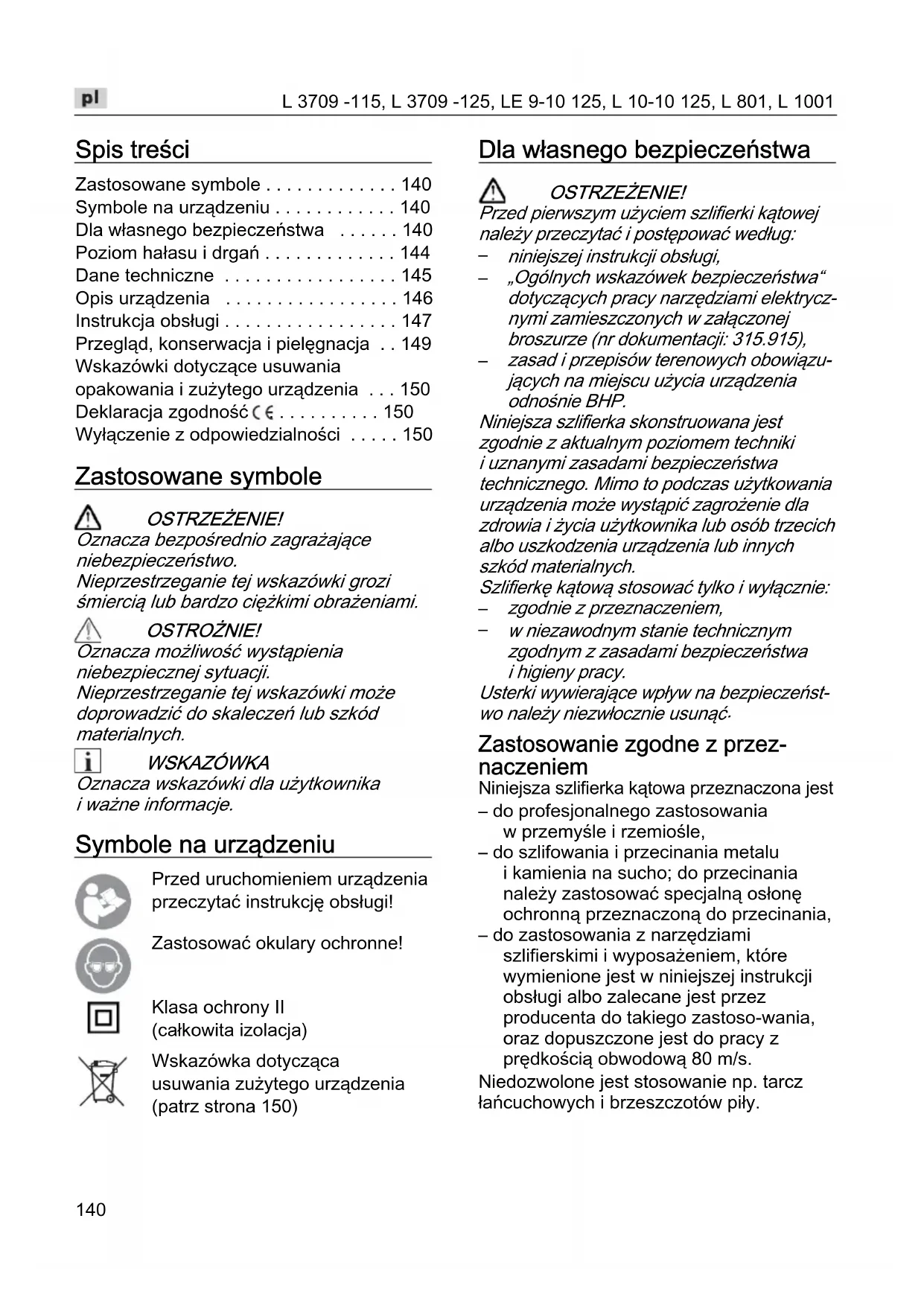 Zastosowanie zgodne z przez- naczeniem Niniejsza szlifierka kątowa przeznaczona jest – do profesjonalnego zastosowania w przemyśle i rzemiośle, – do szlifowania i przecinania metalu i kamienia na sucho; do przecinania należy zastosować specjalną osłonę ochronną przeznaczoną do przecinania, – do zastosowania z narzędziami szlifierskimi i wyposażeniem, które wymienione jest w niniejszej instrukcji obsługi albo zalecane jest przez producenta do takiego zastoso-wania, oraz dopuszczone jest do pracy z prędkością obwodową 80 m/s. Niedozwolone jest stosowanie np. tarcz łańcuchowych i brzeszczotów piły.L 3709 -115, L 3709 -125, LE 9-10 125, L 10-10 125, L 801, L 1001