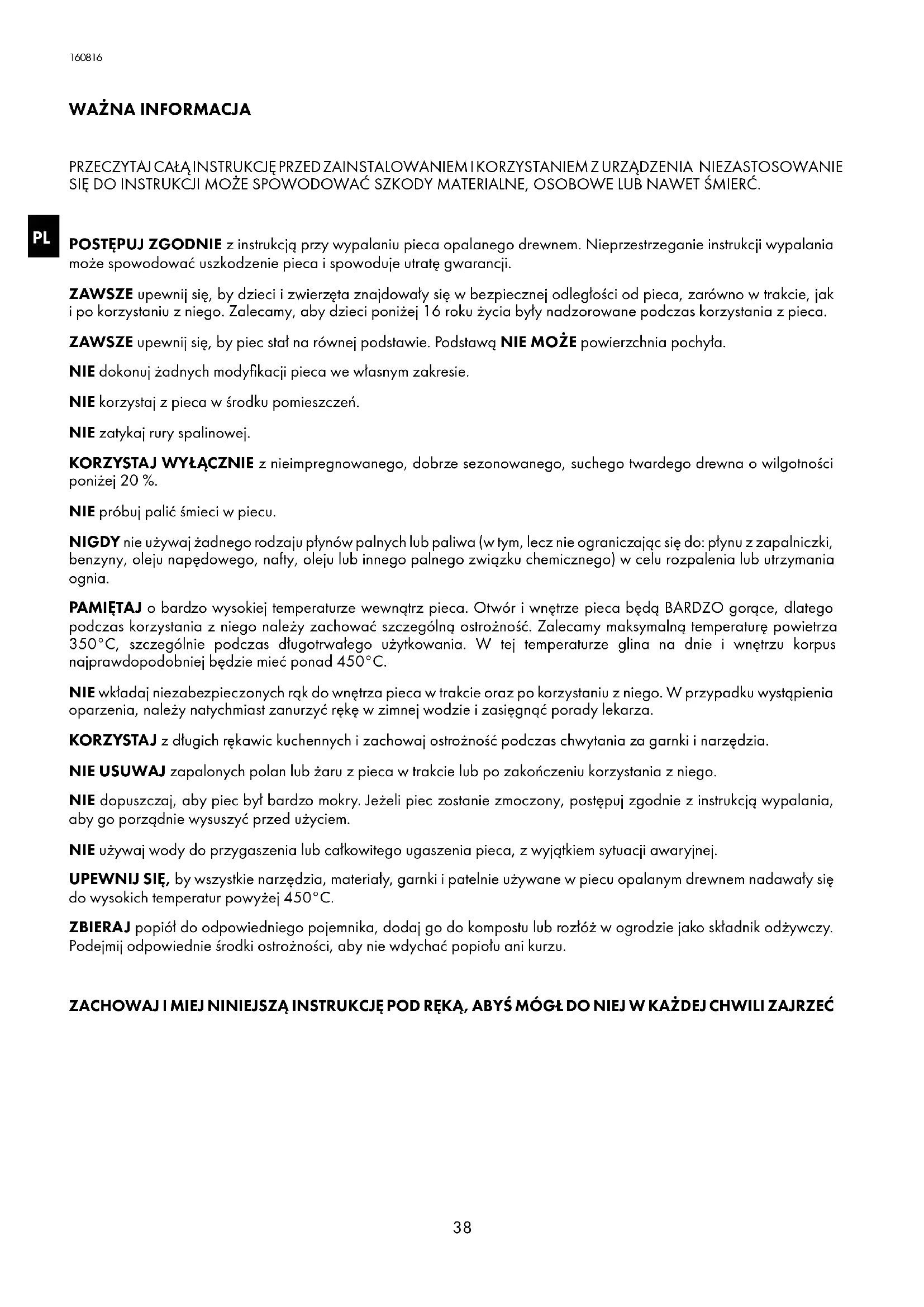 PRZECZYTAJ CAŁĄ INSTRUKCJĘ PRZED ZAINSTALOWANIEM I KORZYSTANIEM Z URZĄDZENIA NIEZASTOSOWANIE SIĘ DO INSTRUKCJI MOŻE SPOWODOWAĆ SZKODY MATERIALNE, OSOBOWE LUB NAWET ŚMIERĆ. POSTĘPUJ ZGODNIE z instrukcją przy wypalaniu pieca opalanego drewnem. Nieprzestrzeganie instrukcji wypalania może spowodować uszkodzenie pieca i spowoduje utratę gwarancji. ZAWSZE upewnij się, by dzieci i zwierzęta znajdowały się w bezpiecznej odległości od pieca, zarówno w trakcie, jak i po korzystaniu z niego. Zalecamy, aby dzieci poniżej 16 roku życia były nadzorowane podczas korzystania z pieca. ZAWSZE upewnij się, by piec stał na równej podstawie. Podstawą NIE MOŻE powierzchnia pochyła. NIE dokonuj żadnych modyfikacji pieca we własnym zakresie. NIE korzystaj z pieca w środku pomieszczeń. NIE zatykaj rury spalinowej. KORZYSTAJ WYŁĄCZNIE z nieimpregnowanego, dobrze sezonowanego, suchego twardego drewna o wilgotności poniżej 20 %. NIE próbuj palić śmieci w piecu. NIGDY nie używaj żadnego rodzaju płynów palnych lub paliwa (w tym, lecz nie ograniczając się do: płynu z zapalniczki, benzyny, oleju napędowego, nafty, oleju lub innego palnego związku chemicznego) w celu rozpalenia lub utrzymania ognia. PAMIĘTAJ o bardzo wysokiej temperaturze wewnątrz pieca. Otwór i wnętrze pieca będą BARDZO gorące, dlatego podczas korzystania z niego należy zachować szczególną ostrożność. Zalecamy maksymalną temperaturę powietrza 350°C, szczególnie podczas długotrwałego użytkowania. W tej temperaturze glina na dnie i wnętrzu korpus najprawdopodobniej będzie mieć ponad 450°C. NIE wkładaj niezabezpieczonych rąk do wnętrza pieca w trakcie oraz po korzystaniu z niego. W przypadku wystąpienia oparzenia, należy natychmiast zanurzyć rękę w zimnej wodzie i zasięgnąć porady lekarza. KORZYSTAJ z długich rękawic kuchennych i zachowaj ostrożność podczas chwytania za garnki i narzędzia. NIE USUWAJ zapalonych polan lub żaru z pieca w trakcie lub po zakończeniu korzystania z niego. NIE dopuszczaj, aby piec był bardzo mokry. Jeżeli piec zostanie zmoczony, postępuj zgodnie z instrukcją wypalania, aby go porządnie wysuszyć przed użyciem. NIE używaj wody do przygaszenia lub całkowitego ugaszenia pieca, z wyjątkiem sytuacji awaryjnej. UPEWNIJ SIĘ, by wszystkie narzędzia, materiały, garnki i patelnie używane w piecu opalanym drewnem nadawały się do wysokich temperatur powyżej 450°C. ZBIERAJ popiół do odpowiedniego pojemnika, dodaj go do kompostu lub rozłóż w ogrodzie jako składnik odżywczy. Podejmij odpowiednie środki ostrożności, aby nie wdychać popiołu ani kurzu. ZACHOWAJ I MIEJ NINIEJSZĄ INSTRUKCJĘ POD RĘKĄ, ABYŚ MÓGŁ DO NIEJ W KAŻDEJ CHWILI ZAJRZEĆ