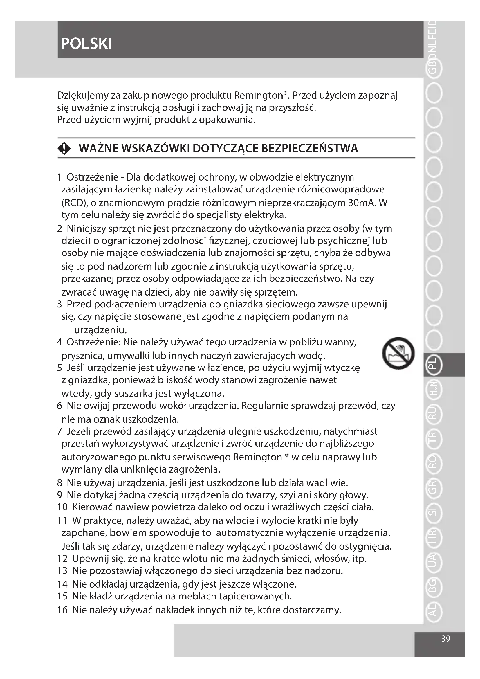 Dziekujemy za zakup nowego produktu Remington. Przed uzyciem zapoznaj sie uwazmie z instrukcja obstugi i zachowaj ja na przyszlość.