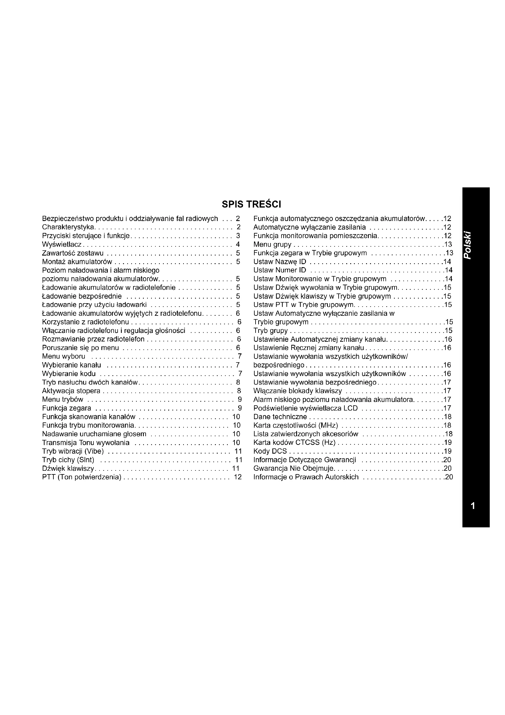 - Informacje o Prawach Autorskich T8_PL.fm Page 1 Thursday, September 16, 2010 3:30 PM2 Polski Bezpieczeństwo produktu i oddziaziaływanie fal radiowych UWAGA! Przed rozpoczęciem użytkowania wyrobu należy zapoznać się z informacjami dotyczącymi narażenia na działanie promieniowania o częstotliwości radiowej oraz instrukcjami zawartymi w broszurze “Zasady bezpiecznego użytkowania wyrobu oraz narażenie na działanie promieniowania o częstotliwości radiowej” dostarczonej z radiotelefonem, ażeby móc zapewnić zgodność z limitami ekspozycji na działanie energii RF. Charakterystyka 8 kanałów PMR 121 kodów (38 kodów CTCSS i 83 kody DCS) Zasięg do 10 km* Latarka LED Wewnętrzny układ nadawania uruchamianego głosem (VOX) 10 alertów wywołania do wyboru Podświetlany wyświetlacz ciekłokrystaliczny Gniazdo do podłączenia opcjonalnego zestawu słuchawkowego Sygnał potwierdzenia PTT Timer Monitorowanie pomieszczenia Skanowanie kanałów Nasłuch dwóch kanałów Blokada klawiatury Tryb oszczędzania baterii Tryb cichy Tryb oszczędzania baterii Wywołanie grupowe Wywołanie bezpośrednie (z identyfikatorem dzwoniącego) Wywołania wszystkich użytkowników Automatyczna zmiana kanału p. 20