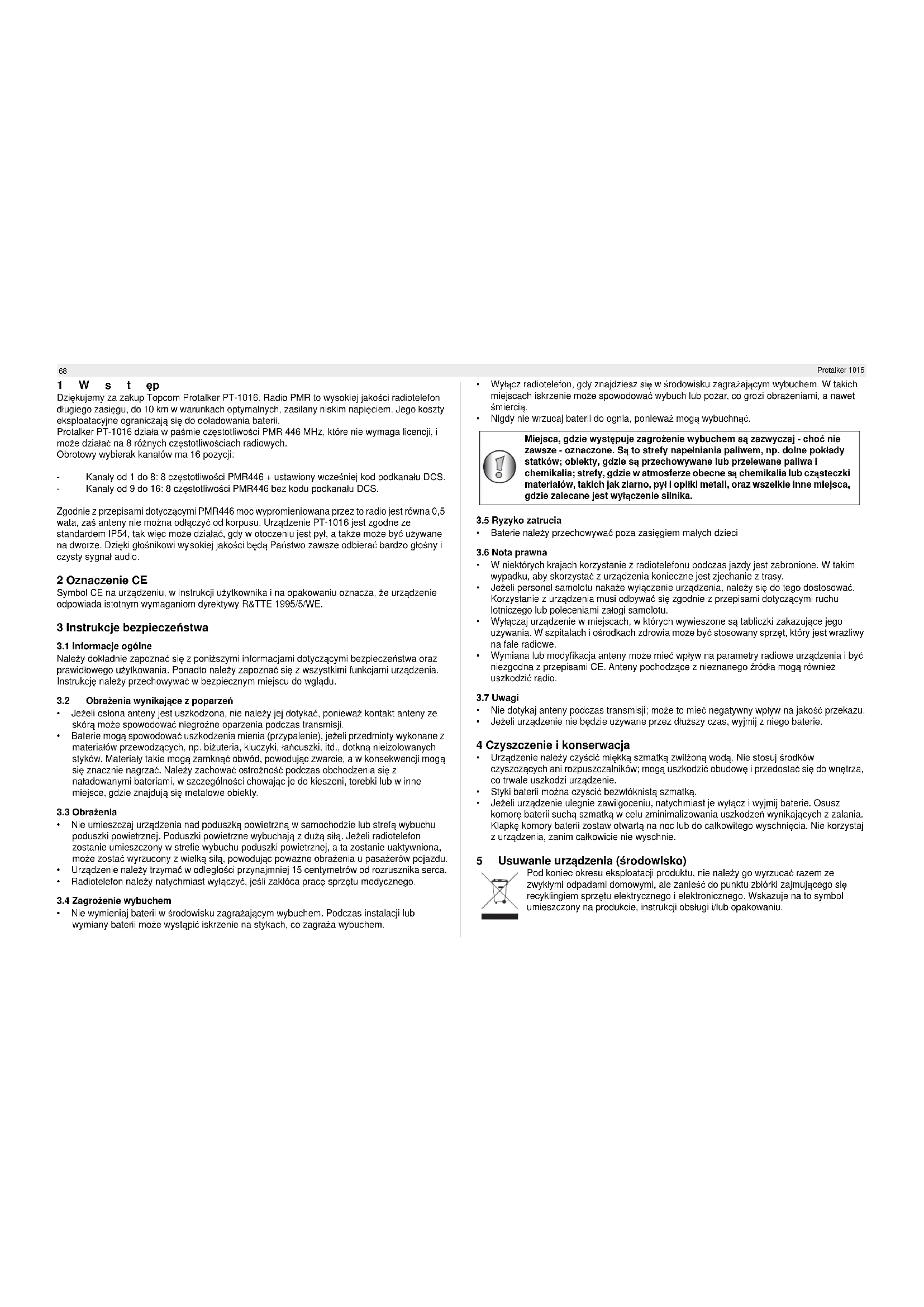 Εάν δεν χρησιμοποιείτε εξωτερικό μεγάφωνο/μικρόφωνο, τοποθετήστε το καπάκι στη θέση του και στερεώστε το με τη βίδα του. Το PT-1016 δεν είναι πλήρως αδιάβροχο στο νερό, όταν χρησιμοποιείτε εξωτερικό μεγάφωνο/μικρόφωνο. Το σχεδιάγραμμα στο Παράρτημα B δείχνει τον τρόπο σύνδεσης του εξωτερικού μεγαφώνου/ μικροφώνου.68 Protalker 1016 1Wstęp Dziękujemy za zakup Topcom Protalker PT-1016. Radio PMR to wysokiej jakości radiotelefon długiego zasięgu, do 10 km w warunkach optymalnych, zasilany niskim napięciem. Jego koszty eksploatacyjne ograniczają się do doładowania baterii. Protalker PT-1016 działa w paśmie częstotliwości PMR 446 MHz, które nie wymaga licencji, i może działać na 8 różnych częstotliwościach radiowych. Obrotowy wybierak kanałów ma 16 pozycji: - Kanały od 1 do 8: 8 częstotliwości PMR446 + ustawiony wcześniej kod podkanału DCS. - Kanały od 9 do 16: 8 częstotliwości PMR446 bez kodu podkanału DCS. Zgodnie z przepisami dotyczącymi PMR446 moc wypromieniowana przez to radio jest równa 0,5 wata, zaś anteny nie można odłączyć od korpusu. Urządzenie PT-1016 jest zgodne ze standardem IP54, tak więc może działać, gdy w otoczeniu jest pył, a także może być używane na dworze. Dzięki głośnikowi wy sokiej jakości będą Państwo zawsze odbierać bardzo głośny i czysty sygnał audio. 2 Oznaczenie CE Symbol CE na urządzeniu, w instrukcji użytkownika i na opakowaniu oznacza, że urządzenie odpowiada istotnym wymaganiom dyrektywy R&TTE 1995/5/WE. 3 Instrukcje bezpieczeństwa