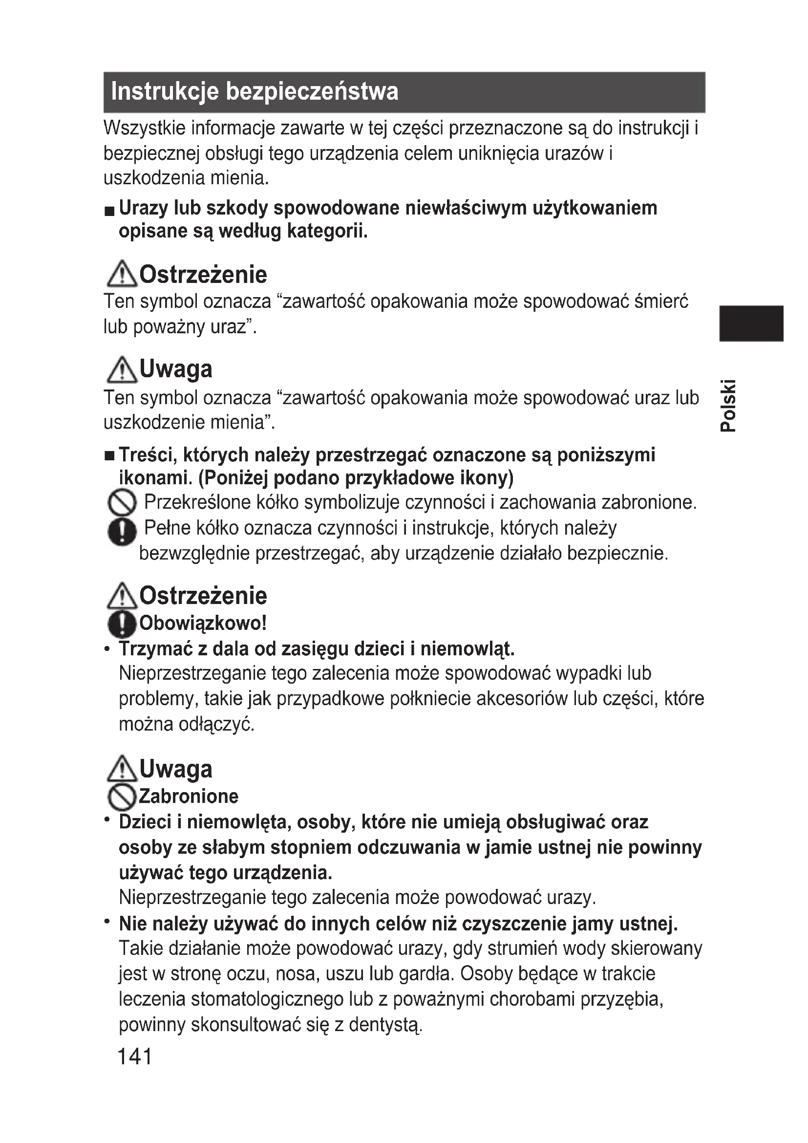- 142 Polski Nienależynapełniaćzbiornikawodąotemperaturzewyższejniż 40°C. Takie działanie może powodować oparzenia. Obowiązkowo! Urządzenienależysanityzowaćorazużywaćświeżejwodyzkranu lubwodyciepłejpodczasczyszczeniajamyustnej. Poużytkowaniu,należypamiętaćowylaniuwodyzezbiornikaoraz włączyćurządzeniena2-3sekundy,abyusunąćwodę. Nieprzestrzeganie tego zalecenia może szkodzić zdrowiu, jeśli urządzenie jest używane bez sanityzacji z powodu rozprzestrzeniania się pleśni i bakterii. Może również powodować nieprzyjemny zapach i niewłaściwe funkcjonowanie. Należyprzestrzegaćzaleceńznajdującychsięnabateriach. Baterienależyprawidłowowłożyćsprawdzającbieguny+oraz-. Zużytebaterienależyniezwłocznieusuwać. Baterienależywyjmowaćwprzypadku,gdyurządzenieniebędzie używaneprzezdłuższyczas. Nienależyprzekraczaćzalecanegookresuprzydatnościbaterii. Takie działanie może spowodować przegrzanie lub wybuch baterii, uraz lub zabrudzenie otoczenia z powodu wycieku. Nierozmontowywać! Nigdynienależymodykowaćurządzenia.Nienależyrównież rozmontowywaćgoaninaprawiać. Takie działanie może spowodować pożar, porażenie prądem lub uraz. Uwaga Urządzenie nie jest przeznaczone do użytku przez osoby (włącznie z dziećmi) o ograniczonych zdolnościach zycznych, czuciowych lub umysłowych lub z brakiem doświadczenia i wiedzy, chyba, że pod nadzorem lub zgodnie z instrukcjami dotyczącymi obsługi urządzenia osoby odpowiedzialnej za ich bezpieczeństwo. Należy pilnować, aby dzieci nie bawiły się urządzeniem.