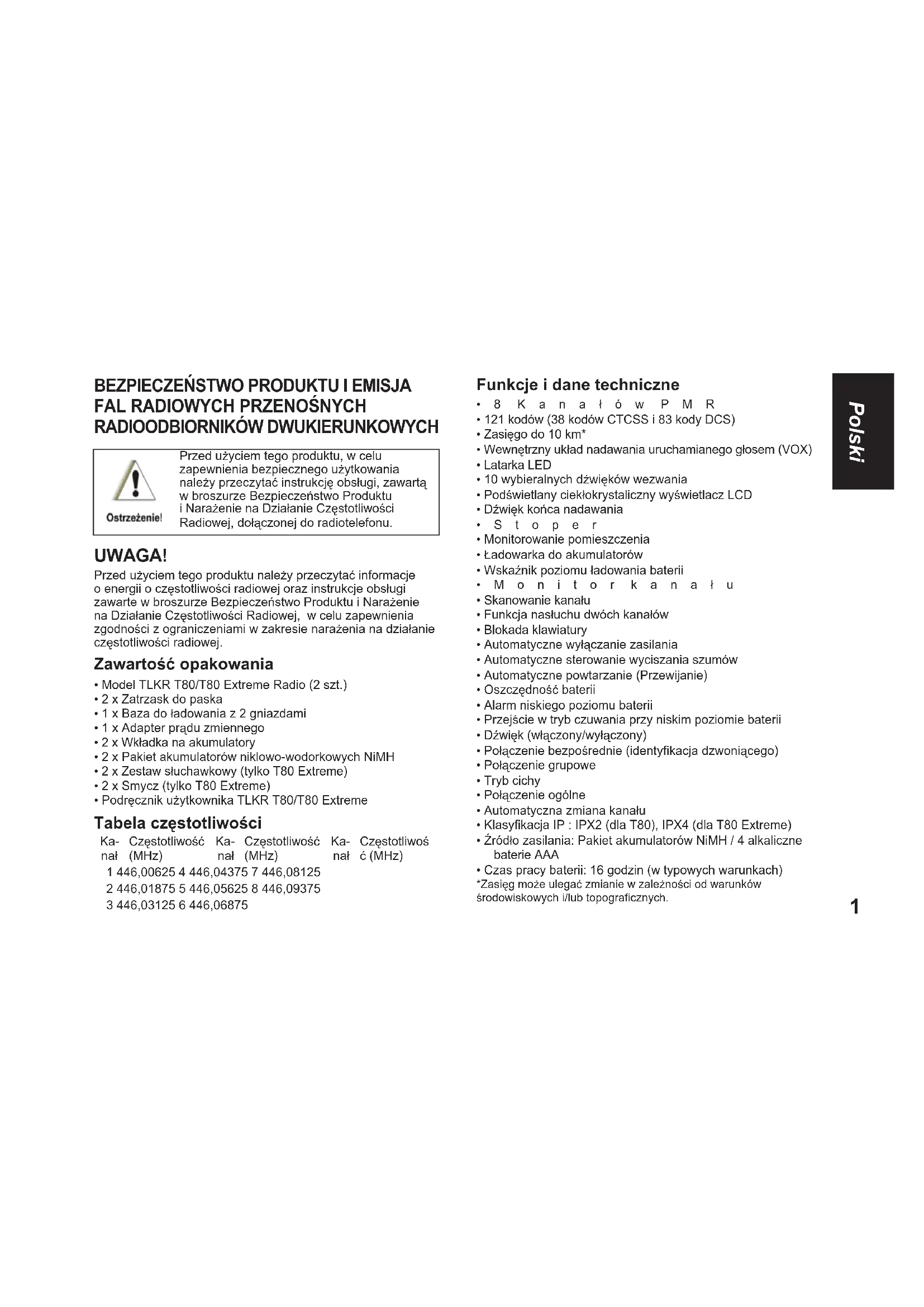 - Podrcznik uytkownika TLKR T80/T80 Extreme Tabela czstotliwoci Funkcje i dane techniczne