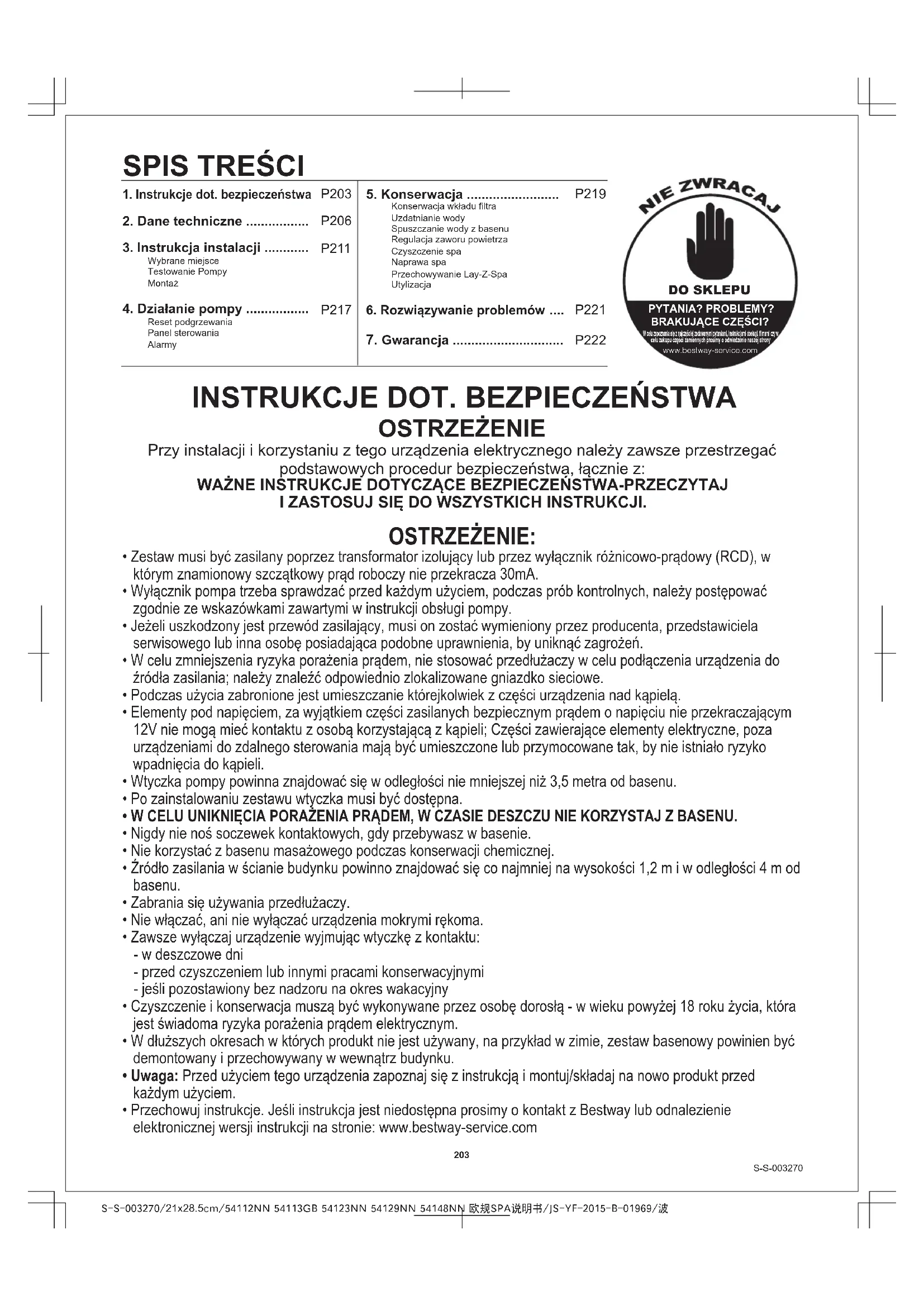 PYTANIA? PROBLEMY?BRAKUJĄCE CZĘŚCI?W celu zapoznania się z najczęściej zadawanymi pytaniami, instrukcjami obsługi, filmami czy wcelu zakupu części zamiennych prosimy o odwiedzenie naszej stronywww.bestway-service.com DO SKLEPUS-S-003270/21x28.5cm/54112NN 54113GB 54123NN 54129NN 54148NN 欧规SPA说明书/JS-YF-2015-B-01969/波 OSTRZEŻENIE: