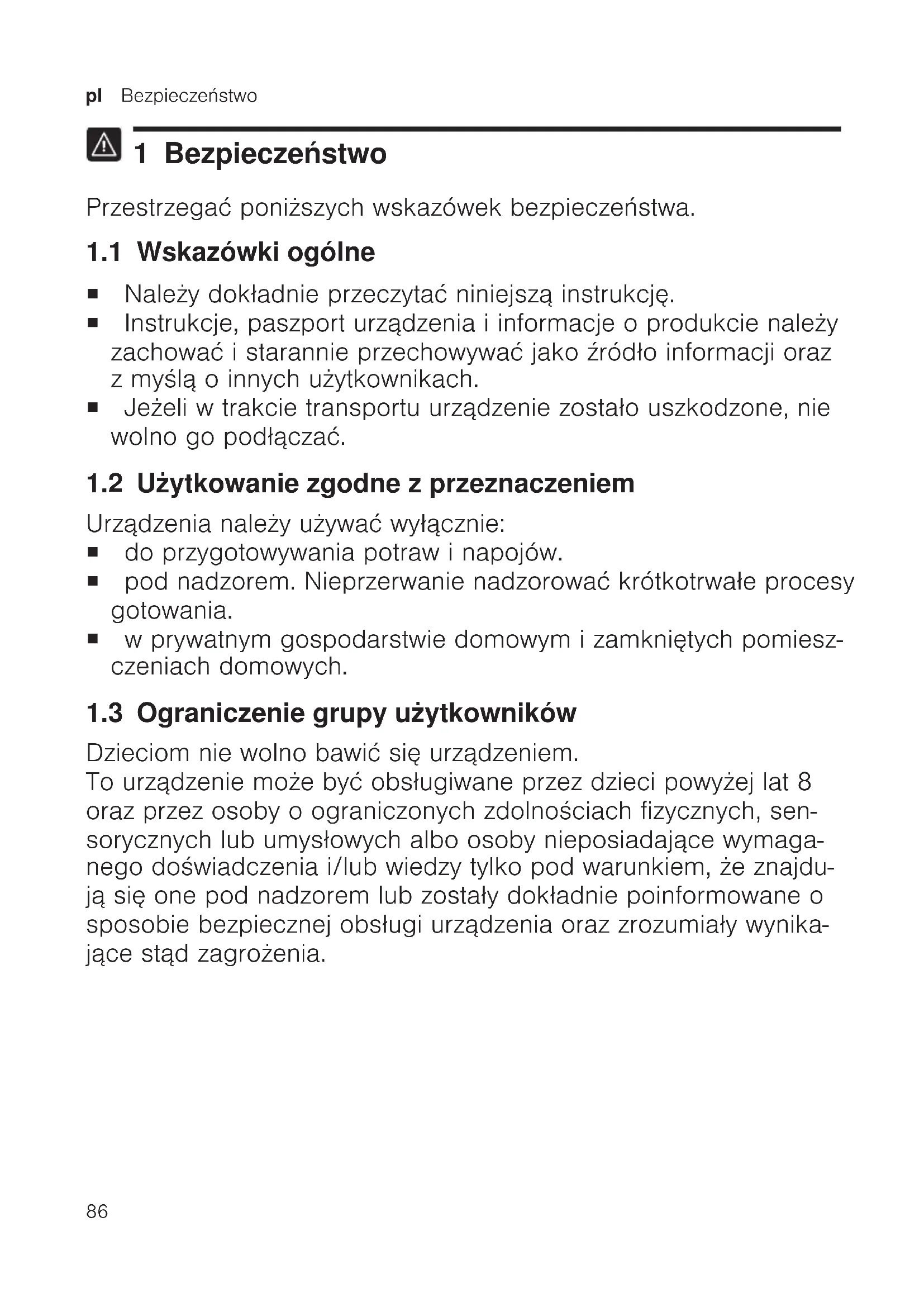 1 Bezpieczeństwo Przestrzegać poniższych wskazówek bezpieczeństwa. 1.1 Wskazówki ogólne ¡ Należy dokładnie przeczytać niniejszą instrukcję. ¡ Instrukcje, paszport urządzenia i informacje o produkcie należy zachować i starannie przechowywać jako źródło informacji oraz z myślą o innych użytkownikach. ¡ Jeżeli w trakcie transportu urządzenie zostało uszkodzone, nie wolno go podłączać. 1.2 Użytkowanie zgodne zprzeznaczeniem Urządzenia należy używać wyłącznie: ¡ do przygotowywania potraw i napojów. ¡ pod nadzorem. Nieprzerwanie nadzorować krótkotrwałe procesy gotowania. ¡ w prywatnym gospodarstwie domowym i zamkniętych pomiesz- czeniach domowych. 1.3 Ograniczenie grupy użytkowników Dzieciom nie wolno bawić się urządzeniem. To urządzenie może być obsługiwane przez dzieci powyżej lat 8 oraz przez osoby oograniczonych zdolnościach fizycznych, sen- sorycznych lub umysłowych albo osoby nieposiadające wymaga- nego doświadczenia i/lub wiedzy tylko pod warunkiem, że znajdu- ją się one pod nadzorem lub zostały dokładnie poinformowane o sposobie bezpiecznej obsługi urządzenia oraz zrozumiały wynika- jące stąd zagrożenia.Bezpieczeństwo pl