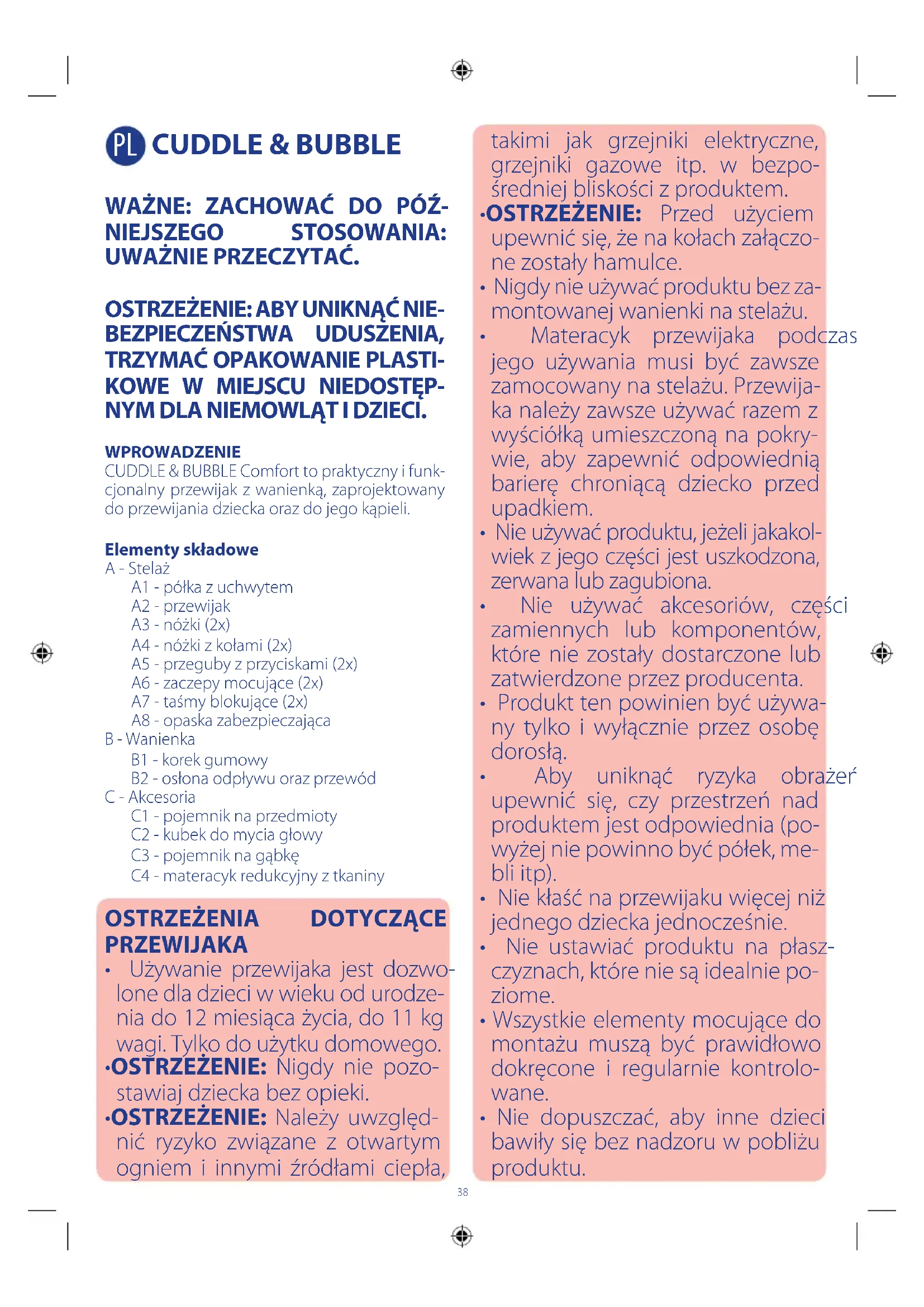 NYM DLA NIEMOWLĄT I DZIECI. WPROWADZENIE CUDDLE & BUBBLE Comfort to praktyczny i funk- cjonalny przewijak z wanienką, zaprojektowany do przewijania dziecka oraz do jego kąpieli. Elementy składowe A - Stelaż A1 - półka z uchwytem A2 - przewijak A3 - nóżki (2x) A4 - nóżki z kołami (2x) A5 - przeguby z przyciskami (2x) A6 - zaczepy mocujące (2x) A7 - taśmy blokujące (2x) A8 - opaska zabezpieczająca B - Wanienka B1 - korek gumowy B2 - osłona odpływu oraz przewód C - Akcesoria C1 - pojemnik na przedmioty C2 - kubek do mycia głowy C3 - pojemnik na gąbkę C4 - materacyk redukcyjny z tkaniny