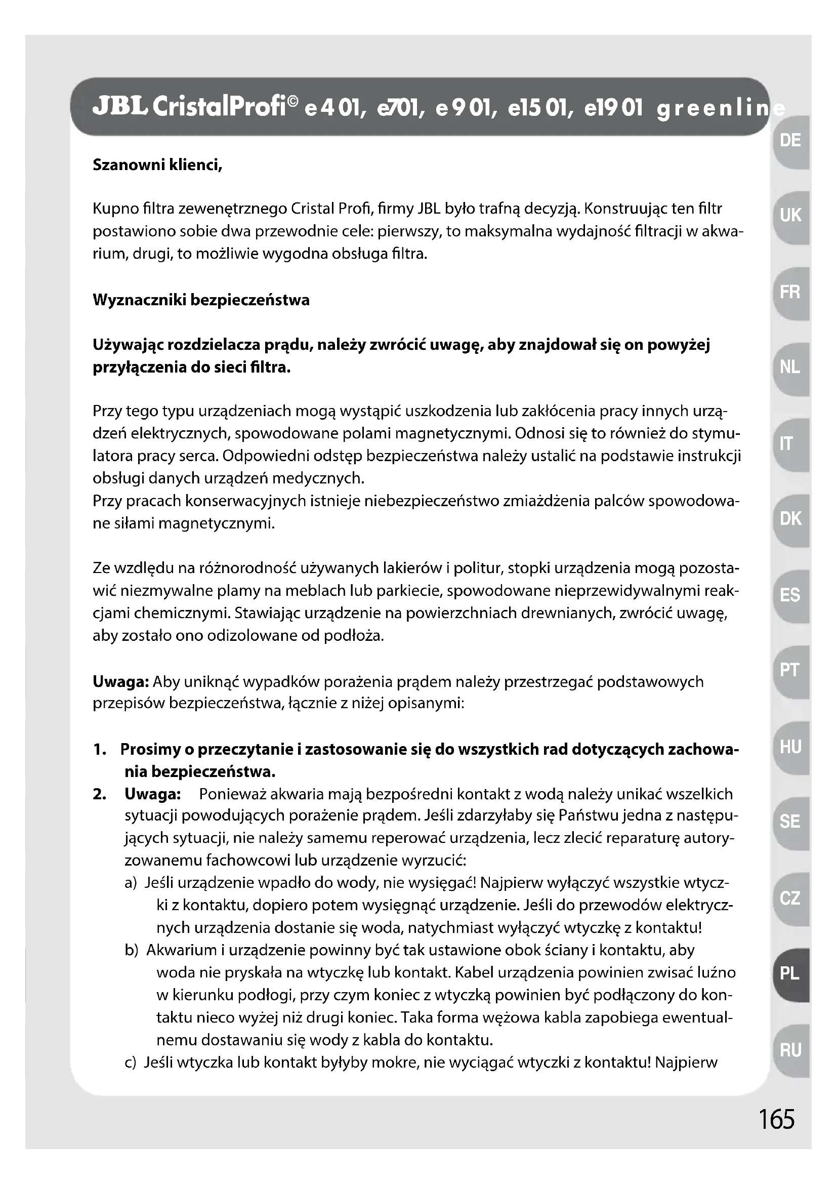 č.serie: _ _ - _ _- _ _ _ _ _ _ _ / _ _ / _ _ Datum prodeje a razítko prodejce Stručný popis závady: Datum:................................................ Podpis:................................................ zde nalepte doklad o prodeji:165 Szanowni klienci,Kupno ltra zewenętrznego Cristal Pro, rmy JBL było trafną decyzją. Konstruując ten ltr postawiono sobie dwa przewodnie cele: pierwszy, to maksymalna wydajność ltracji w akwa-rium, drugi, to możliwie wygodna obsługa ltra.Wyznaczniki bezpieczeństwaUżywając rozdzielacza prądu, należy zwrócić uwagę, aby znajdował się on powyżej przyłączenia do sieci ltra.Przy tego typu urządzeniach mogą wystąpić uszkodzenia lub zakłócenia pracy innych urzą-dzeń elektrycznych, spowodowane polami magnetycznymi. Odnosi się to również do stymu-latora pracy serca. Odpowiedni odstęp bezpieczeństwa należy ustalić na podstawie instrukcji obsługi danych urządzeń medycznych.Przy pracach konserwacyjnych istnieje niebezpieczeństwo zmiażdżenia palców spowodowa-ne siłami magnetycznymi.Ze wzdlędu na różnorodność używanych lakierów i politur, stopki urządzenia mogą pozosta-wić niezmywalne plamy na meblach lub parkiecie, spowodowane nieprzewidywalnymi reak-cjami chemicznymi. Stawiając urządzenie na powierzchniach drewnianych, zwrócić uwagę, aby zostało ono odizolowane od podłoża.Uwaga: Aby uniknąć wypadków porażenia prądem należy przestrzegać podstawowych przepisów bezpieczeństwa, łącznie z niżej opisanymi:1. Prosimy o przeczytanie i zastosowanie się do wszystkich rad dotyczących zachowa-nia bezpieczeństwa.2. Uwaga: Ponieważ akwaria mają bezpośredni kontakt z wodą należy unikać wszelkich sytuacji powodujących porażenie prądem. Jeśli zdarzyłaby się Państwu jedna z następu-jących sytuacji, nie należy samemu reperować urządzenia, lecz zlecić reparaturę autory-zowanemu fachowcowi lub urządzenie wyrzucić:a) Jeśli urządzenie wpadło do wody, nie wysięgać! Najpierw wyłączyć wszystkie wtycz-ki z kontaktu, dopiero potem wysięgnąć urządzenie. Jeśli do przewodów elektrycz-nych urządzenia dostanie się woda, natychmiast wyłączyć wtyczkę z kontaktu!b) Akwarium i urządzenie powinny być tak ustawione obok ściany i kontaktu, aby woda nie pryskała na wtyczkę lub kontakt. Kabel urządzenia powinien zwisać luźno w kierunku podłogi, przy czym koniec z wtyczką powinien być podłączony do kon-taktu nieco wyżej niż drugi koniec. Taka forma wężowa kabla zapobiega ewentual-nemu dostawaniu się wody z kabla do kontaktu. c) Jeśli wtyczka lub kontakt byłyby mokre, nie wyciągać wtyczki z kontaktu! Najpierw JBL CristalProfi