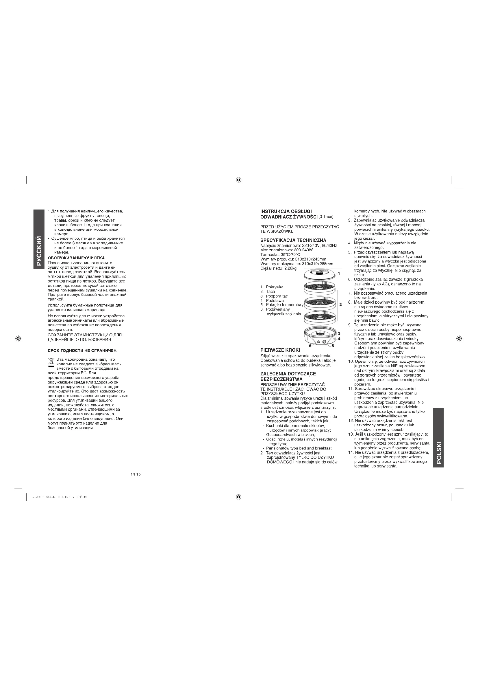 - Suszone mięso, drób i ryba, nie powinny być przechowywane dłużej niż 3 miesiące, jeśli trzymane w lodówce, lub rok jeśli w zamrażalniku. KONSERwACJA I CZYSZCZENIE Po użyciu, odłączyć odwadniacz od zasilania i pozwolić mu ostygnąć przed przystąpieniem do czyszczenia. Do usuwania przylegającej żywności używać miękkiej szczotki. Osuszyć wszystkie części przed składowaniem odwadniacza. Oczyścić powierzchnię korpusu zwilżoną ściereczką. Do usuwania nadmiaru marynatów stosować ręczniki papierowe. By nie uszkodzić powierzchni nie stosować agresywnych chemikaliów i środków szorujących. PROSZĘ ZACHOWAĆ TE WSKAZÓWKI, DZIĘKUJEMY! Symbol widoczny po lewej oznacza, że – na terenie UE – niniejszy produkt nie może być utylizowany wraz z odpadami domowymi. Aby uniknąć zagrożeń dla środowiska lub zdrowia ludzkiego, wynikających z niekontrolowanej utylizacji odpadów, poddaj sprzęt recyklingowi, promując odpowiedzialne wykorzystywanie surowców. Aby zwrócić zużyty sprzęt, skorzystaj z sieci punktów odbioru elektrośmieci, lub skontaktuj się ze sprzedawcą produktu. Sprzedawcy mają możliwość przekazania elektrośmieci do bezpiecznego recyklingu.